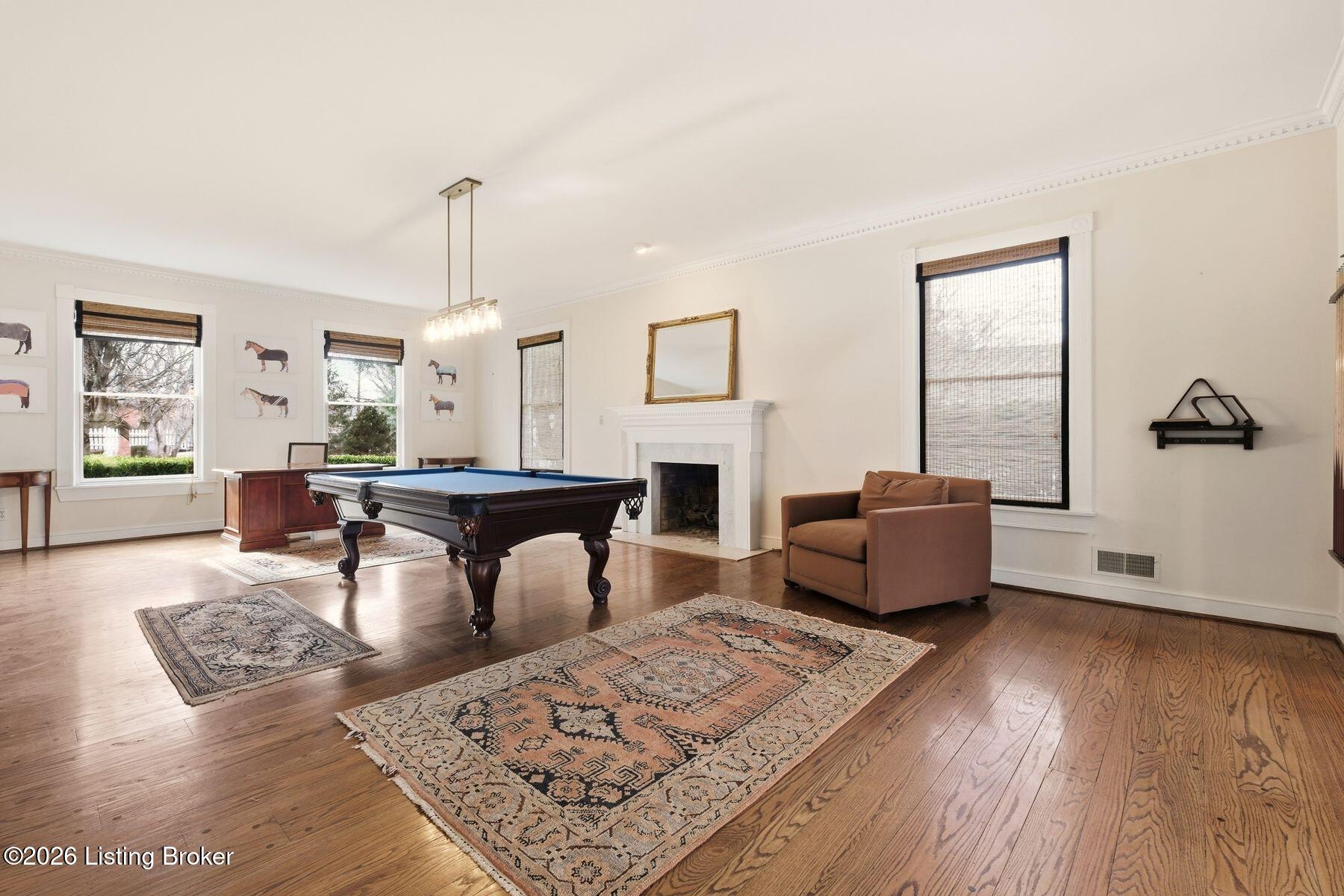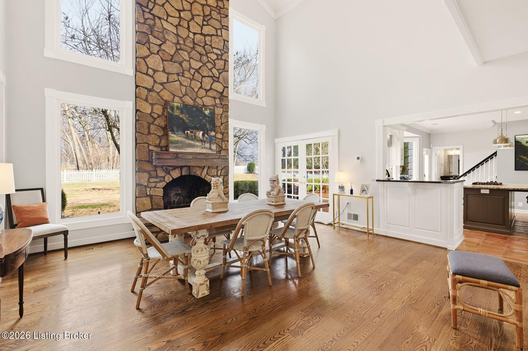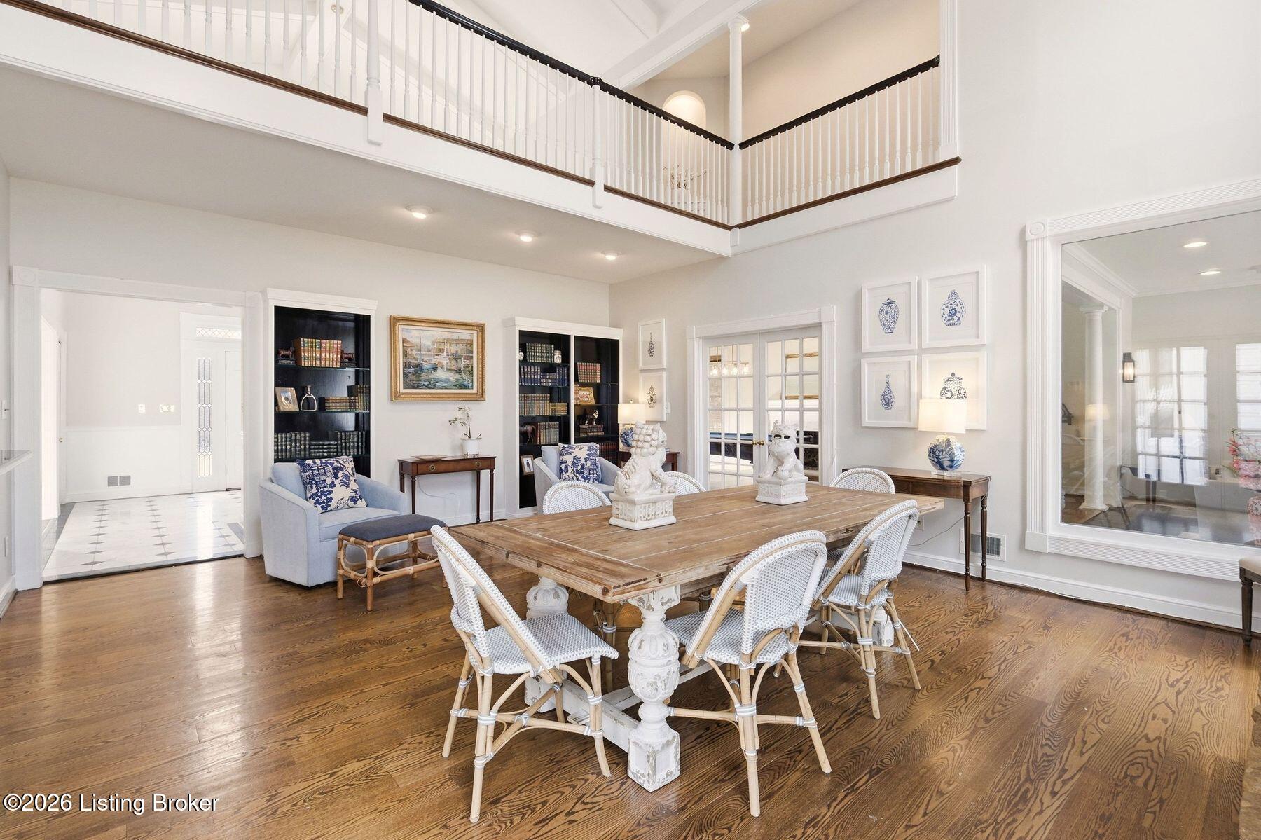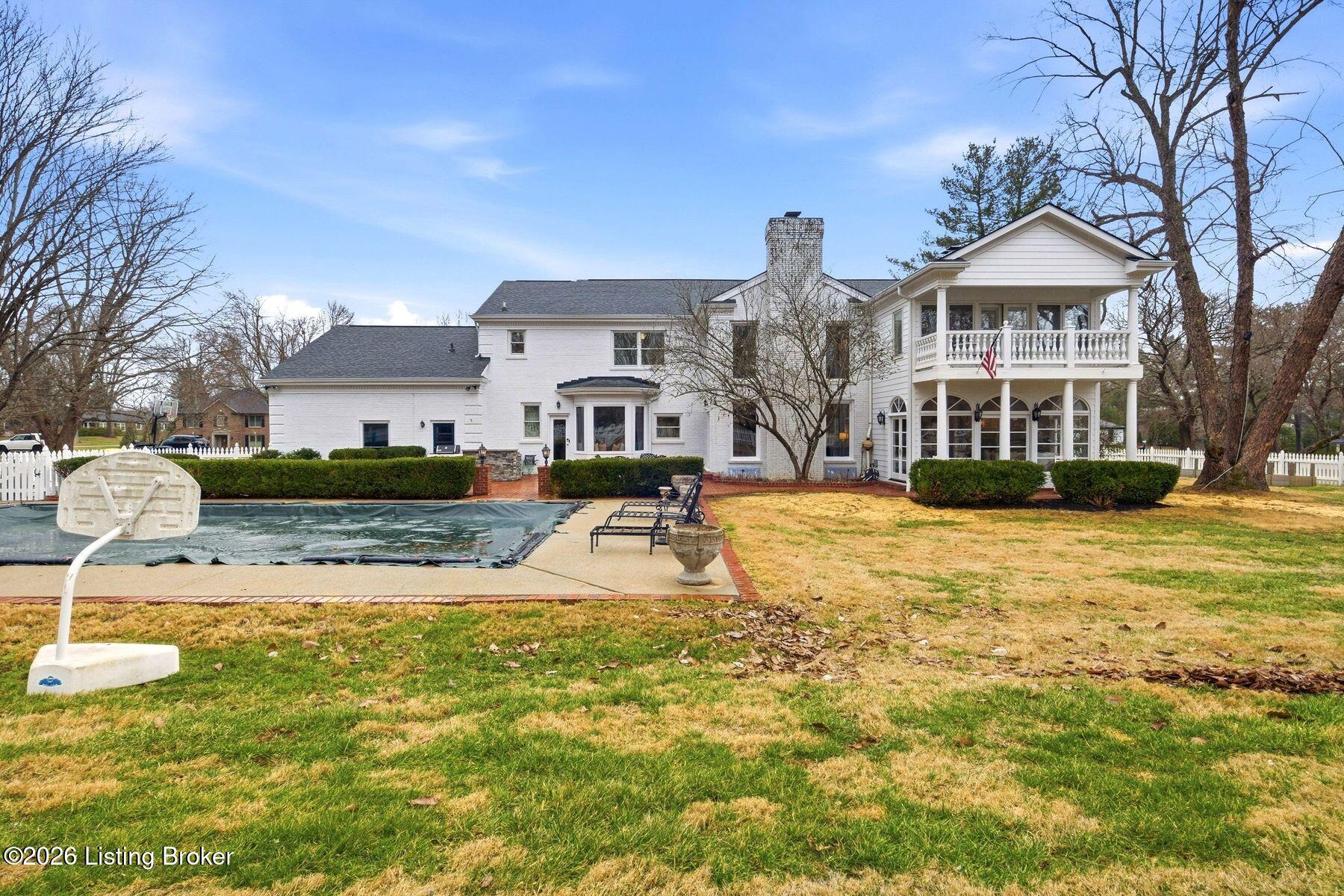 Overlooking the 15th green of the Harmony Landing Country Club, this timeless two-story estate home features southern colonial charm in a parklike setting. Sitting on 1 acre and surrounded by mature trees, homeowners will enjoy use of the home's incredible backyard with in-ground pool, brick terrace, columned porch, and large side yards for added privacy. Past a semicircular driveway and towering front porch, guest first arrive into the two-story foyer with classic black and white tile flooring, winding staircase, and two convenient coat closets. A large formal dining room sits to the right while the grand living room sits to the left. With a columned entrance and slate tile floors, the home's sun room addition features panoramic views of the green backyard and woods beyond. A soaring two-story great room anchored by a floor-to-ceiling stone fireplace centers the home and features bright picture windows, vaulted ceiling, and built-in bookshelves. From the great room, the open floor plan guides guests into the stunning eat-in kitchen with stainless steel appliances, floor-to-ceiling cabinetry, custom bench area, granite countertops, and large breakfast bar. Homeowners will appreciate the adjacent laundry room with custom shelving, second refrigerator, wet sink, and additional storage. A full bath and 3-car garage complete the first floor. The second floor features a unique primary suite wing with spacious primary bedroom, private balcony, luxurious primary bath, and impressive closet with individual sides and custom cabinetry. The opposite wing of the second floor features two bedrooms with shared full bath, cozy office or homework station, and guest suite with en-suite bath and walk-in closet. The lower level features spacious family room with fireplace and built-in bookshelves, exercise area, game room, full bath, and bonus room currently used as 5th bedroom.