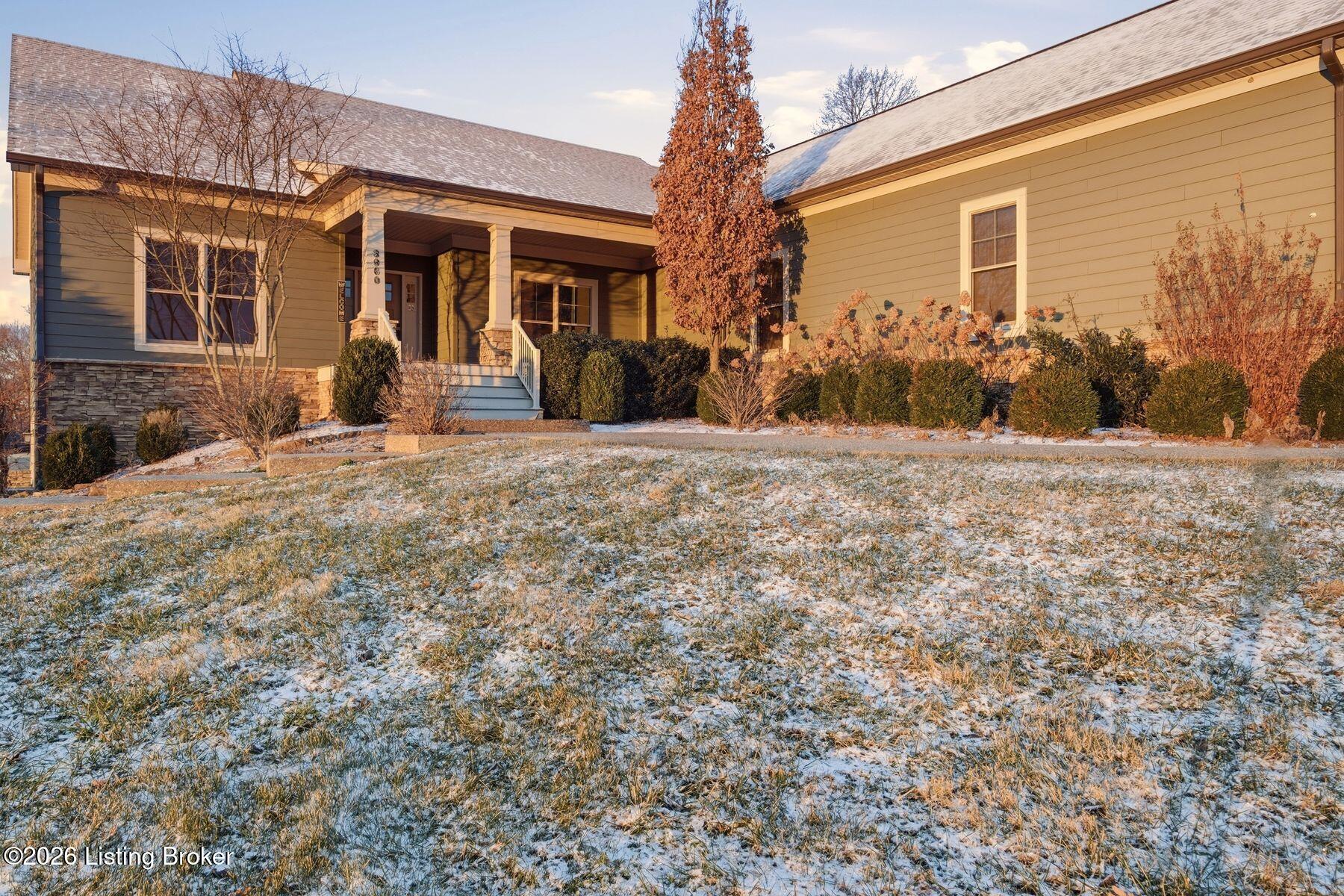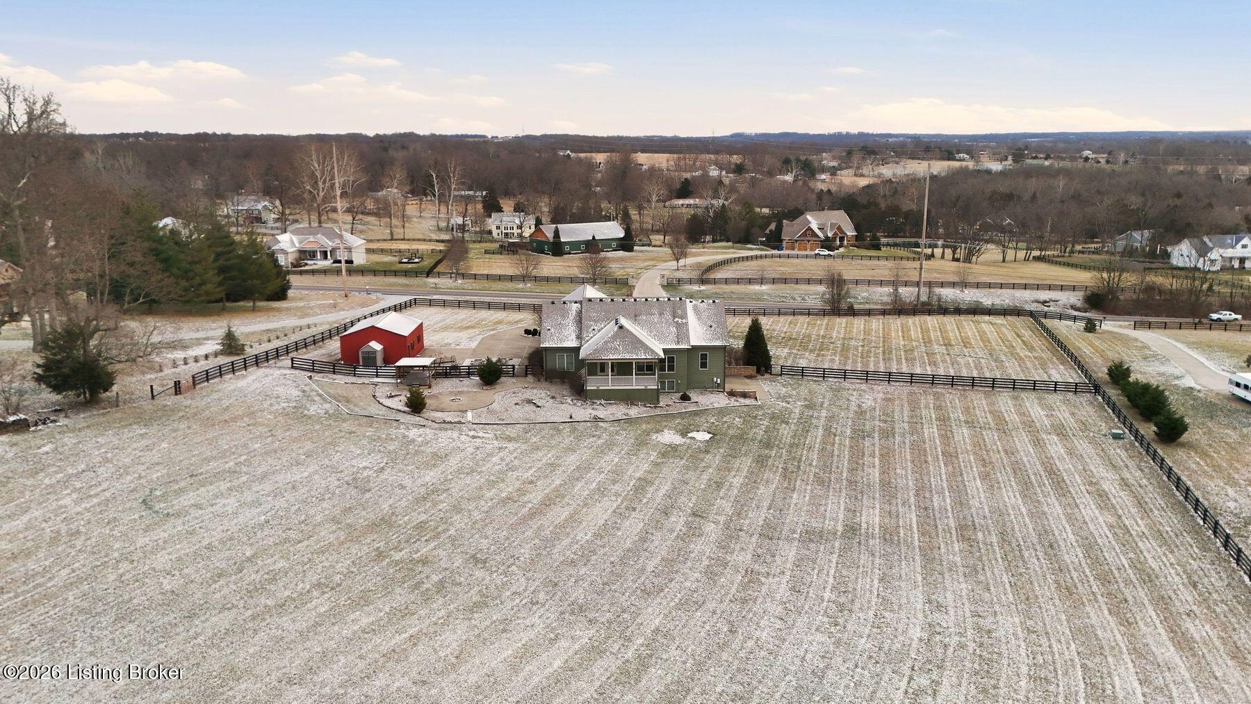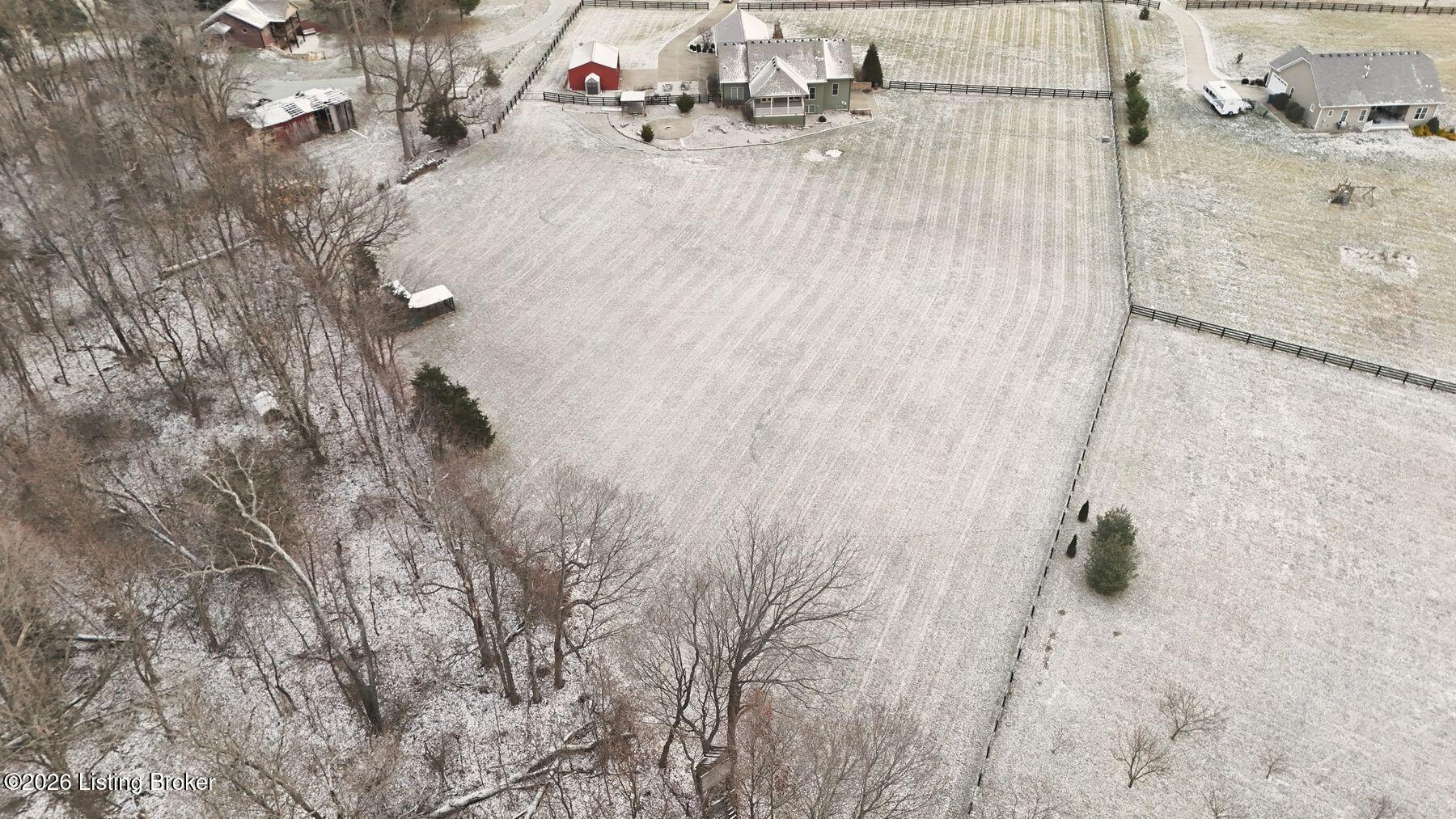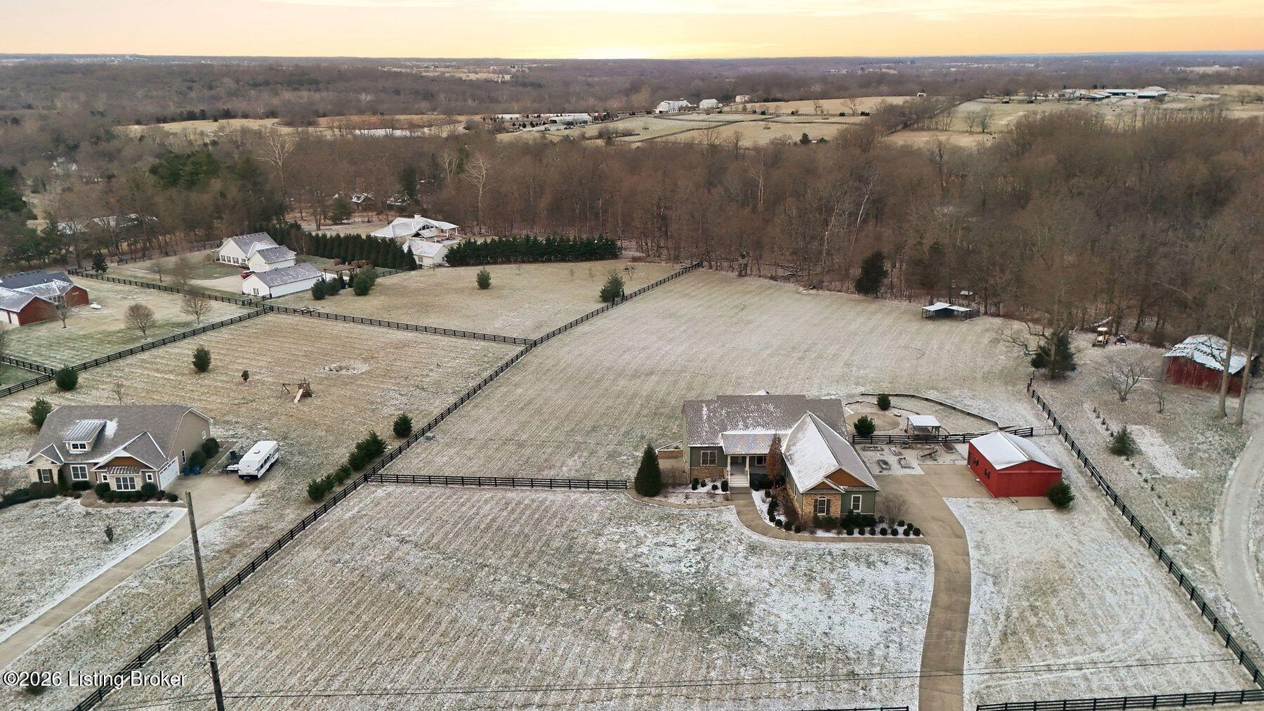 Presenting a quintessential Kentucky experience, this scenic estate offers the rare opportunity to own 3.24 acres of gently rolling Oldham County countryside, complete with newer construction 4+ bedroom ranch, 3+ car garage, scenic patio with hot tub & fire pit, and 24x30 metal barn. Whether looking to take advantage of Oldham County's sought after school system or simply looking for private land in a convenient location, this is the home to see! The 2017-built ranch offers a desirable open floor plan with bright windows, sleek hardwood floors, and soaring ceilings throughout the first floor, along with a separate walkout basement with second fully equipped kitchen, family room, and extra space for guests- perfect for separate living quarters or extended stays. An inviting covered front porch first welcomes guests into the foyer and formal dining room of the first floor before opening to the home's stunning great room with vaulted ceiling, exposed beams, towering fireplace, and built-in bookshelves. From the great room, guests are invited to enjoy the updated eat-in kitchen with stylish gray cabinetry, granite countertops, stainless steel appliances, breakfast bar, and pantry. The adjacent breakfast room offers a cozy space for sharing meals along with access to the home's rear covered deck with scenic countryside views. The first floor continues with a sizable primary suite with vaulted tray ceiling, walk-in closet, and luxurious primary bathroom with dual vanities, shower, and soaking tub. The opposite wing of the home features two spacious bedrooms and updated full bathroom. The first floor is complete with an oversize laundry/mud room and attached 3.5 car garage. Perfect for extended in-law stays or larger families, the walkout lower level features a second kitchen, dining area, family room, game area, bedroom, full bath, office (which could be used as a 5th bedroom), and additional room for storage with second laundry hookups. The home's incredible backyard offers an everyday getaway, featuring stunning views among mature trees and rolling acreage. Homeowners will enjoy use of the spacious deck, entertaining patio, and hot tub, while appreciating the investment of classic four-board fencing already in place. Perfect for additional storage, hobbies, or a large workshop, the home's newer metal barn is sure to impress. Located just minutes from I-71 and downtown La Grange, this home is not to be missed!