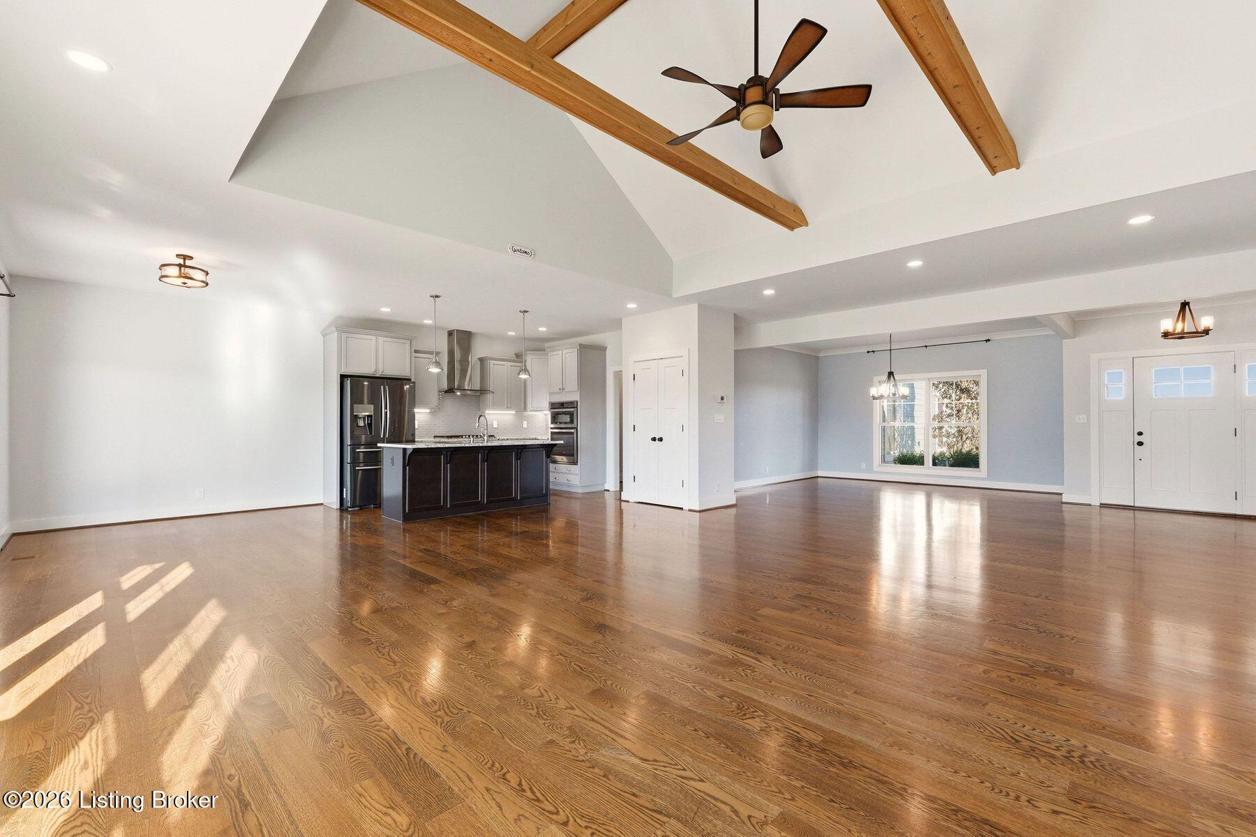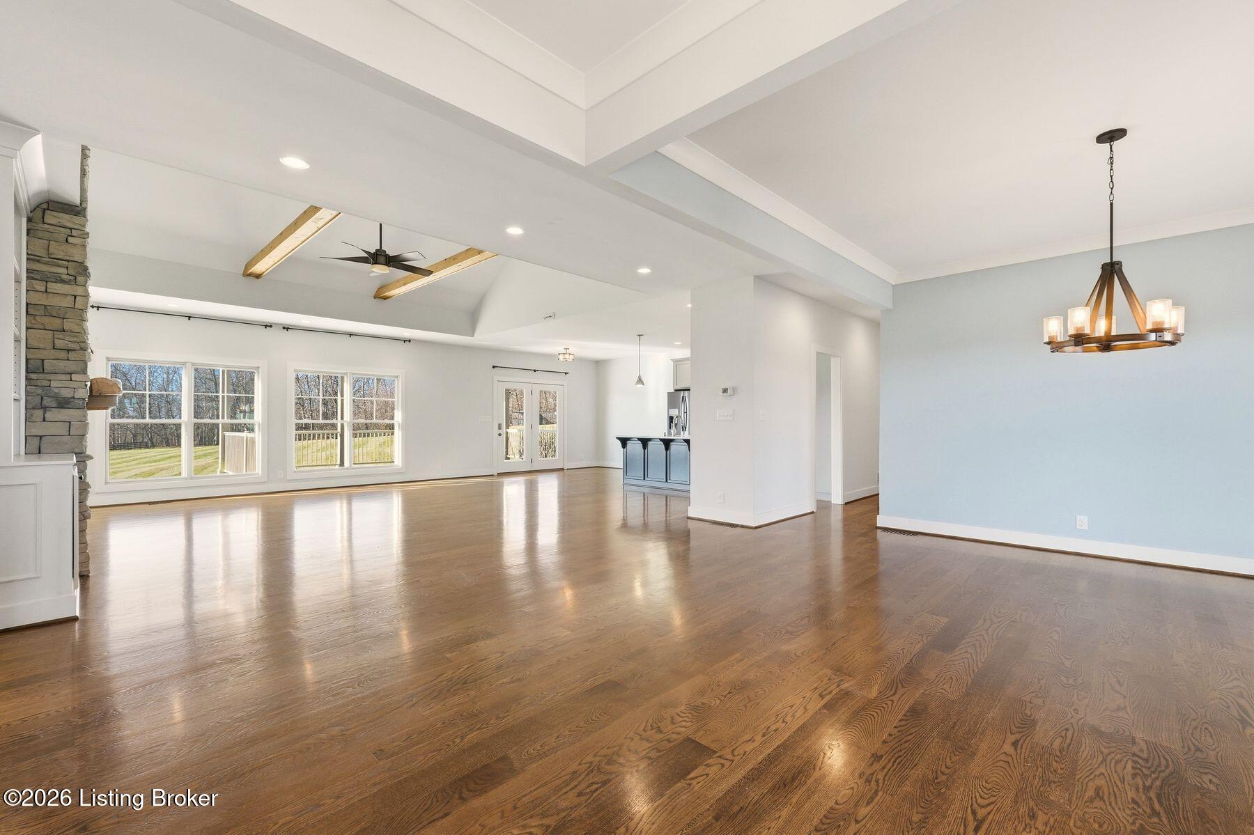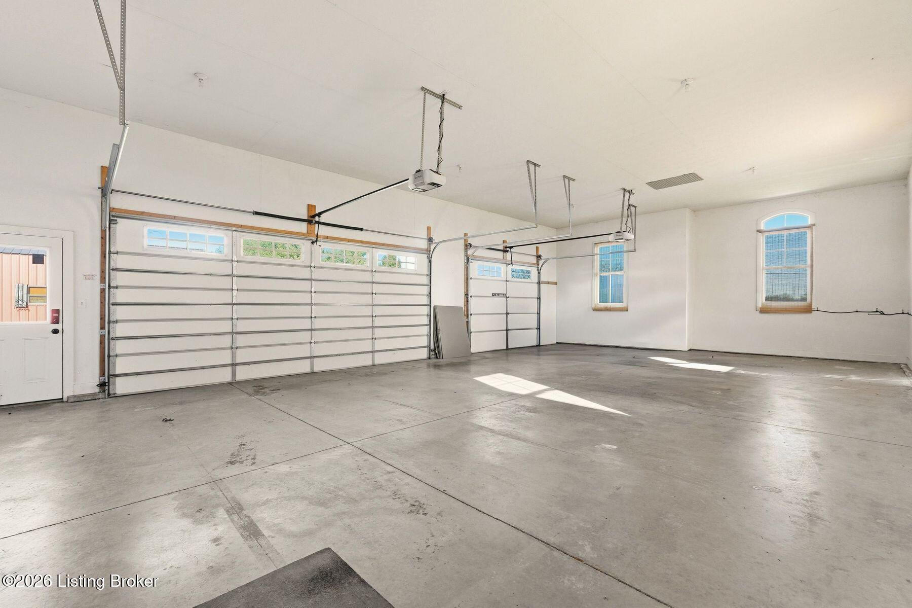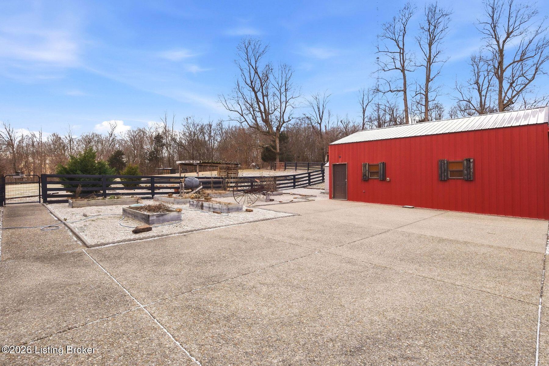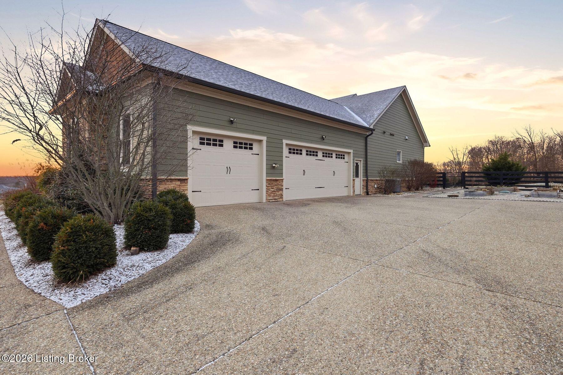 Presenting a quintessential Kentucky experience, this scenic estate offers the rare opportunity to own 3.24 acres of gently rolling Oldham County countryside, complete with newer construction 4+ bedroom ranch, 3+ car garage, scenic patio with hot tub & fire pit, and 24x30 metal barn. Whether looking to take advantage of Oldham County's sought after school system or simply looking for private land in a convenient location, this is the home to see! The 2017-built ranch offers a desirable open floor plan with bright windows, sleek hardwood floors, and soaring ceilings throughout the first floor, along with a separate walkout basement with second fully equipped kitchen, family room, and extra space for guests- perfect for separate living quarters or extended stays. An inviting covered front porch first welcomes guests into the foyer and formal dining room of the first floor before opening to the home's stunning great room with vaulted ceiling, exposed beams, towering fireplace, and built-in bookshelves. From the great room, guests are invited to enjoy the updated eat-in kitchen with stylish gray cabinetry, granite countertops, stainless steel appliances, breakfast bar, and pantry. The adjacent breakfast room offers a cozy space for sharing meals along with access to the home's rear covered deck with scenic countryside views. The first floor continues with a sizable primary suite with vaulted tray ceiling, walk-in closet, and luxurious primary bathroom with dual vanities, shower, and soaking tub. The opposite wing of the home features two spacious bedrooms and updated full bathroom. The first floor is complete with an oversize laundry/mud room and attached 3.5 car garage. Perfect for extended in-law stays or larger families, the walkout lower level features a second kitchen, dining area, family room, game area, bedroom, full bath, office (which could be used as a 5th bedroom), and additional room for storage with second laundry hookups. The home's incredible backyard offers an everyday getaway, featuring stunning views among mature trees and rolling acreage. Homeowners will enjoy use of the spacious deck, entertaining patio, and hot tub, while appreciating the investment of classic four-board fencing already in place. Perfect for additional storage, hobbies, or a large workshop, the home's newer metal barn is sure to impress. Located just minutes from I-71 and downtown La Grange, this home is not to be missed!