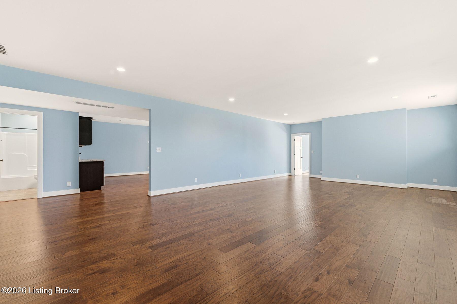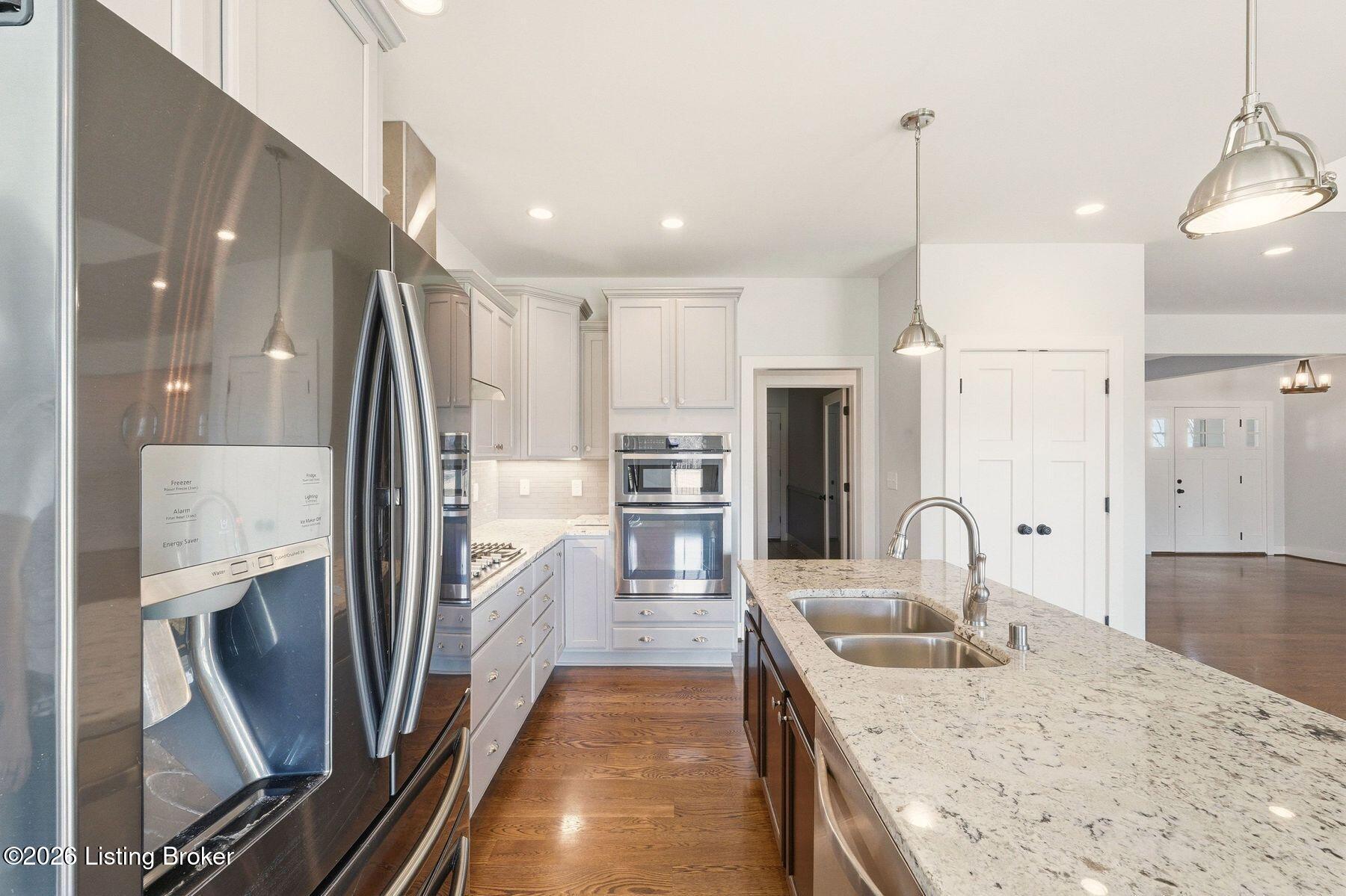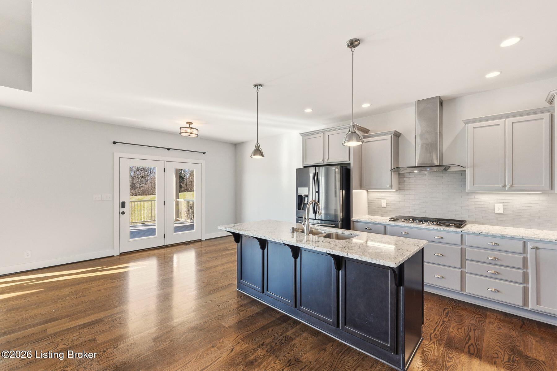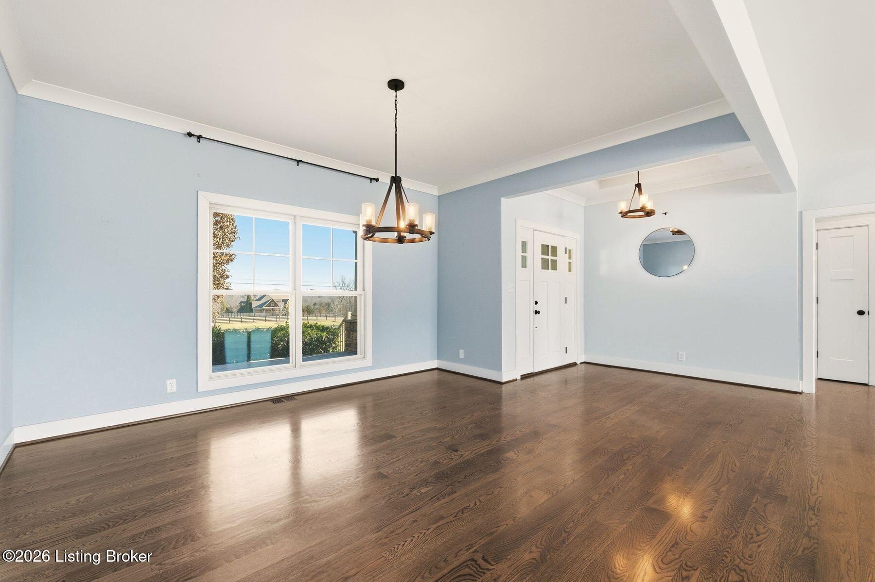 Presenting a quintessential Kentucky experience, this scenic estate offers the rare opportunity to own 3.24 acres of gently rolling Oldham County countryside, complete with newer construction 4+ bedroom ranch, 3+ car garage, scenic patio with hot tub & fire pit, and 24x30 metal barn. Whether looking to take advantage of Oldham County's sought after school system or simply looking for private land in a convenient location, this is the home to see! The 2017-built ranch offers a desirable open floor plan with bright windows, sleek hardwood floors, and soaring ceilings throughout the first floor, along with a separate walkout basement with second fully equipped kitchen, family room, and extra space for guests- perfect for separate living quarters or extended stays. An inviting covered front porch first welcomes guests into the foyer and formal dining room of the first floor before opening to the home's stunning great room with vaulted ceiling, exposed beams, towering fireplace, and built-in bookshelves. From the great room, guests are invited to enjoy the updated eat-in kitchen with stylish gray cabinetry, granite countertops, stainless steel appliances, breakfast bar, and pantry. The adjacent breakfast room offers a cozy space for sharing meals along with access to the home's rear covered deck with scenic countryside views. The first floor continues with a sizable primary suite with vaulted tray ceiling, walk-in closet, and luxurious primary bathroom with dual vanities, shower, and soaking tub. The opposite wing of the home features two spacious bedrooms and updated full bathroom. The first floor is complete with an oversize laundry/mud room and attached 3.5 car garage. Perfect for extended in-law stays or larger families, the walkout lower level features a second kitchen, dining area, family room, game area, bedroom, full bath, office (which could be used as a 5th bedroom), and additional room for storage with second laundry hookups. The home's incredible backyard offers an everyday getaway, featuring stunning views among mature trees and rolling acreage. Homeowners will enjoy use of the spacious deck, entertaining patio, and hot tub, while appreciating the investment of classic four-board fencing already in place. Perfect for additional storage, hobbies, or a large workshop, the home's newer metal barn is sure to impress. Located just minutes from I-71 and downtown La Grange, this home is not to be missed!