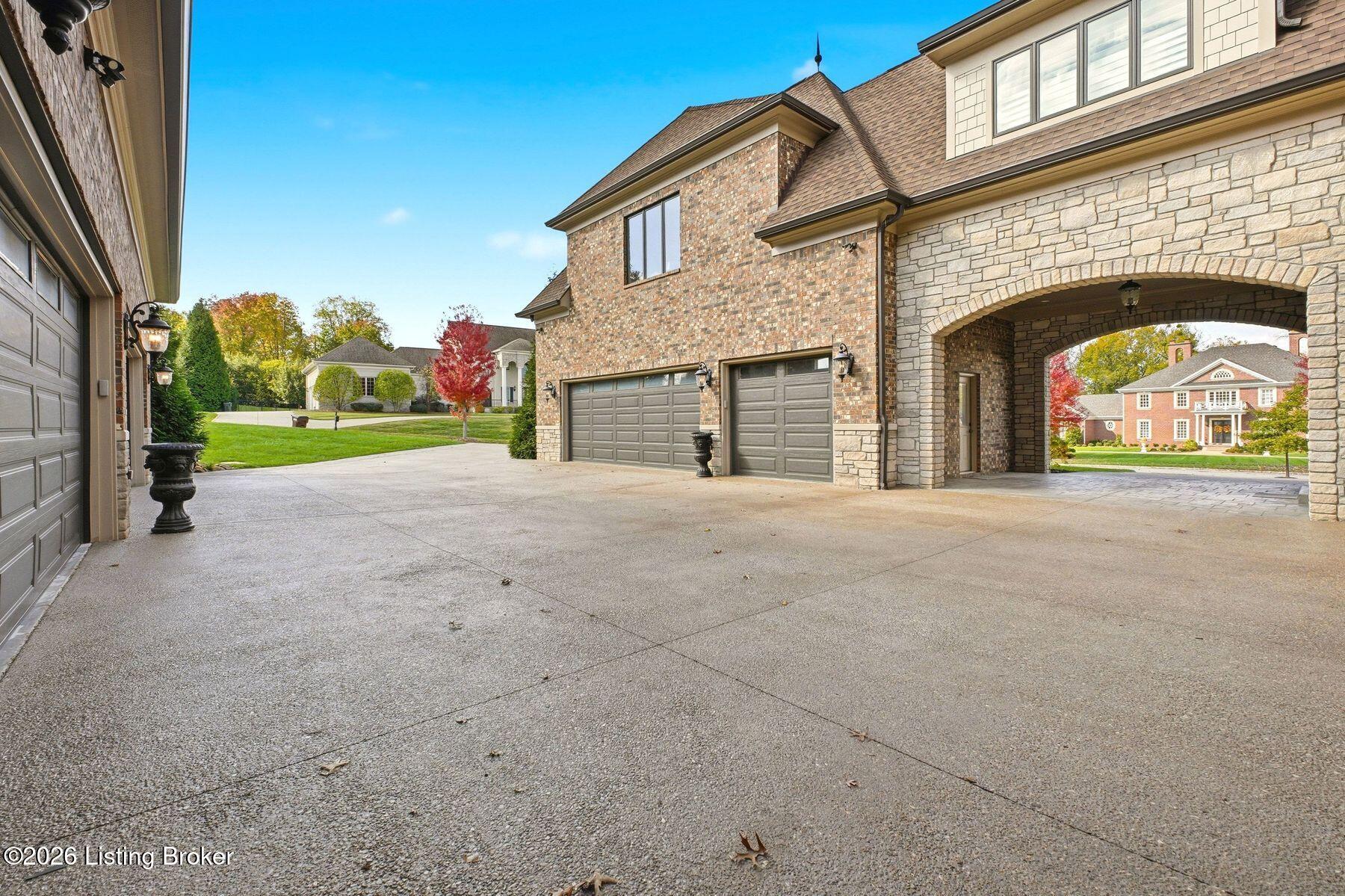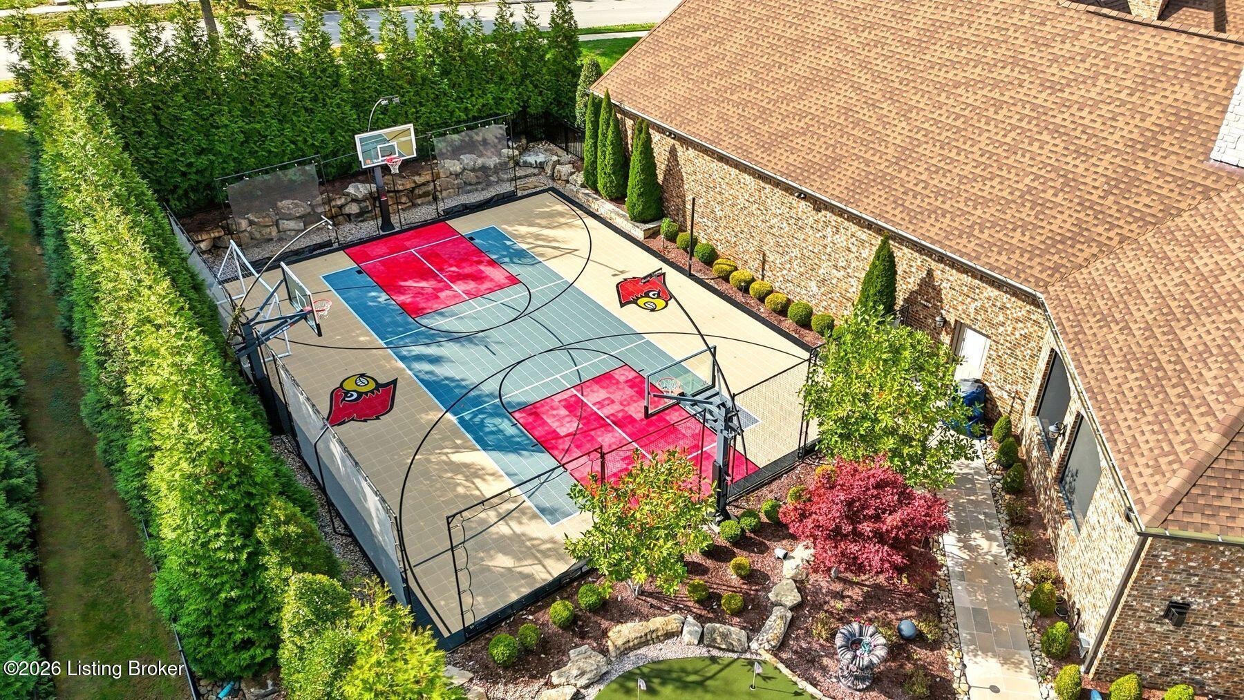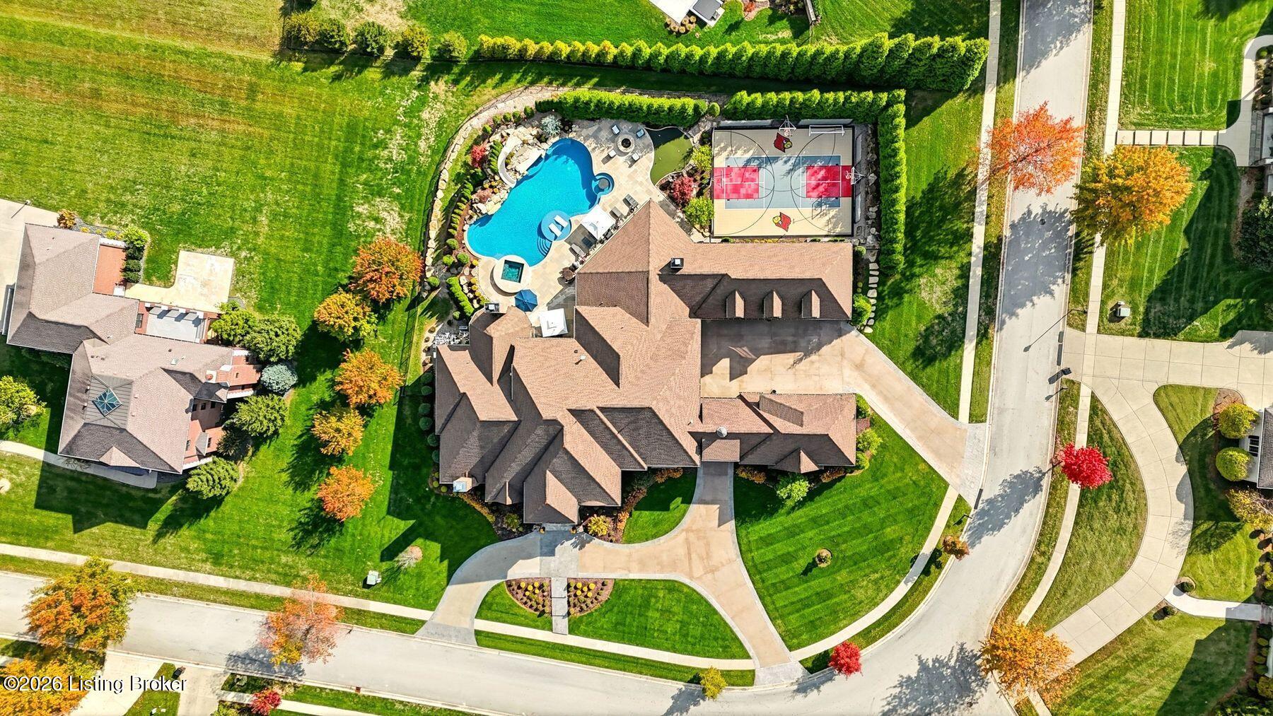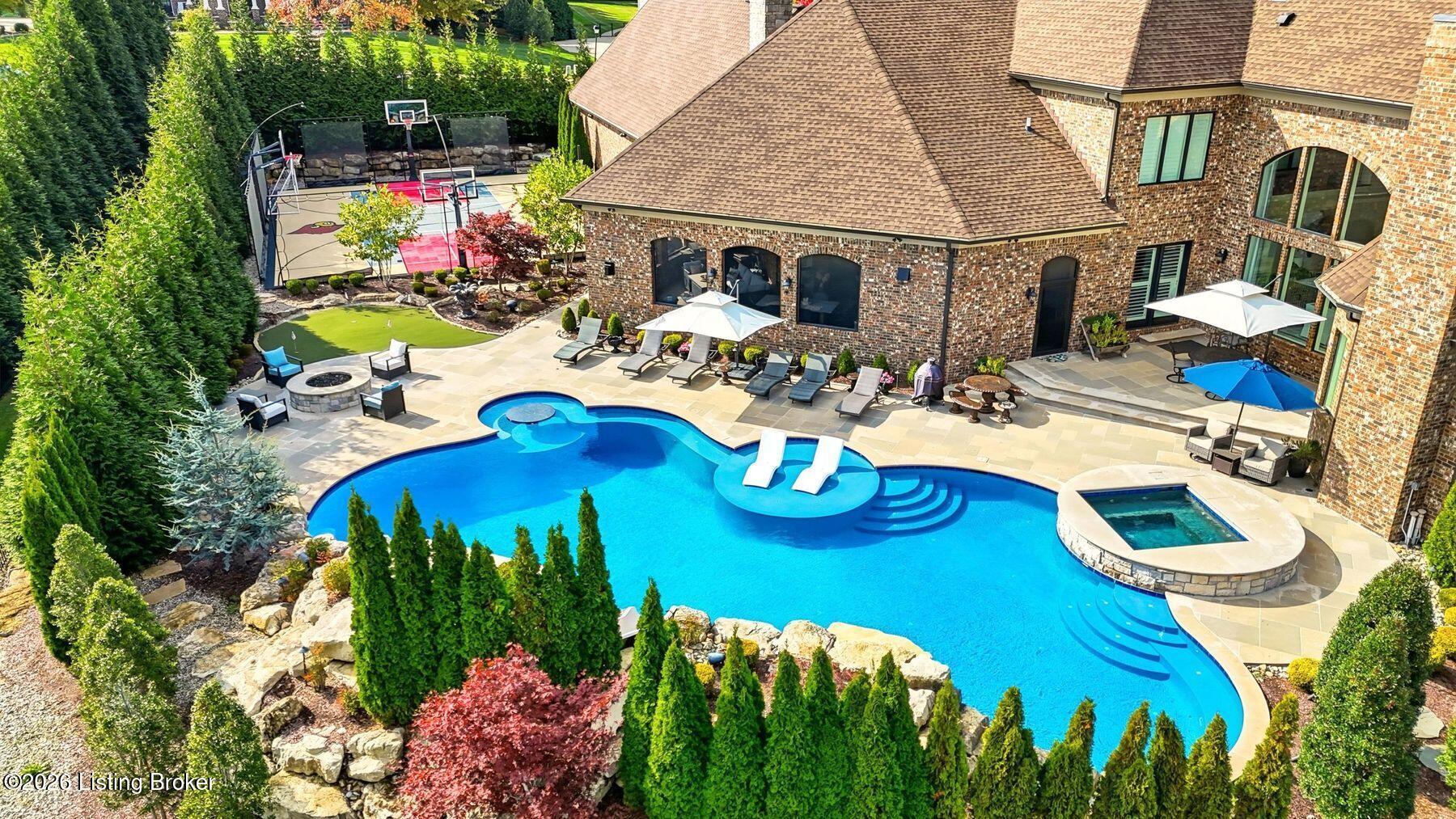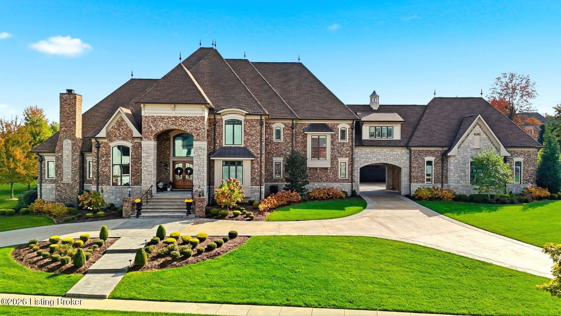 Tucked within one of Louisville's most coveted enclaves, this extraordinary custom estate redefines luxury at scale--offering more than 13,000 square feet of meticulously crafted living space. From the moment you approach along the circular drive, the property reveals its stature. A grand foyer unfolds with sightlines that capture the home's remarkable millwork, sweeping archways, and intricate ceiling treatments. Every detail has been curated to impress--from artisan inlays to master-crafted woodwork that elevates each space with a sense of bespoke artistry. At the heart of the home lies a culinary haven designed for both function and unforgettable gatherings. With double-layered granite surfaces, custom off-white cabinetry, a warm hearth-side ambiance, and professional-grade appliances this kitchen is truly in a league of its own. The flowing layout connects seamlessly to a vaulted hearth room with a floor-to-ceiling creek-stone fireplace and an additional family room framed by coffered ceilings perfect for effortless entertaining. The primary suite is an ode to luxury living. Romantic arched ceilings, a fireplace-lit soaking tub, a spa-inspired steam shower, and dual boutique-style closets create a private world of indulgence. The bedroom itself features elegant tray ceilings with ambient shadow-box lighting, a fireside sitting area, and direct access to the resort-style pool terrace blurring the line between indoor comfort and outdoor serenity. A graceful staircase leads to three spacious bedroom suites, an airy loft, and a cozy sitting area. Ample unfinished space provides flexibility for storage or future customization. Created for hosting and leisure, the lower level is nothing short of spectacular. A state-of-the-art theater, expansive entertainment bar, and an immersive golf simulator room make it the ultimate retreat. A dedicated fitness room and two additional bedrooms with daylight windows add comfort and convenience for guests. The outdoor living experience rivals luxury vacation destinations. The gunite saltwater pool with waterfall, hot tub, and surrounding lounging terraces sets the tone. Beyond the pool, manicured putting greens and a full-scale, multi-sport court with three basketball goals offer tennis, volleyball, pickleball, and basketball perfect for both family fun and serious athletes. An outdoor pavilion featuring a fireplace, grill, and refrigerator connects directly to the kitchen, creating an effortless indoor-outdoor flow ideal for hosting at any scale. More than a magnificent residence, this estate delivers a lifestyle one that balances privacy, comfort, grandeur, and recreation. It is a rare opportunity to live within a personal resort crafted for unforgettable moments and everyday ease.