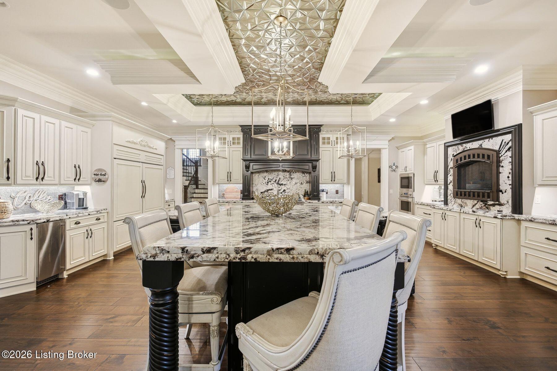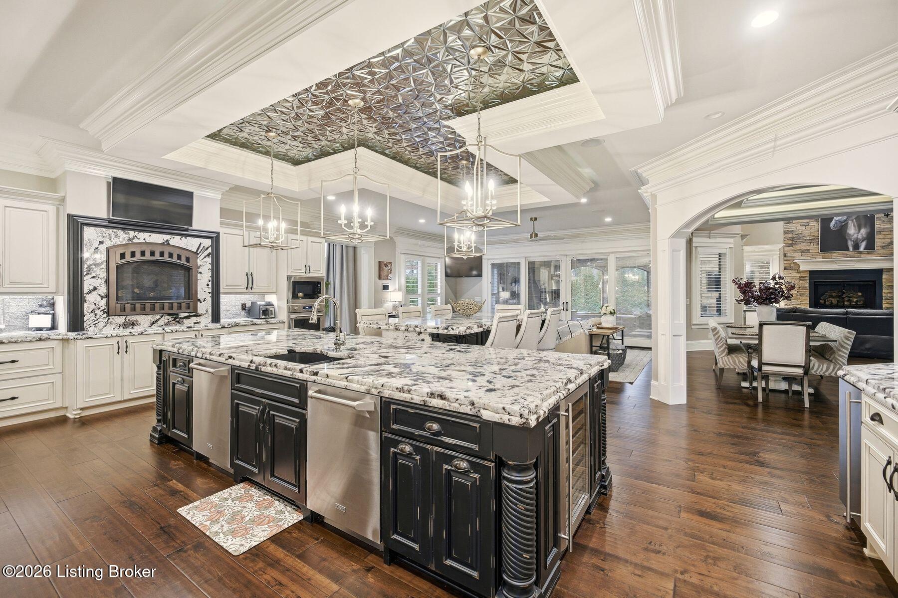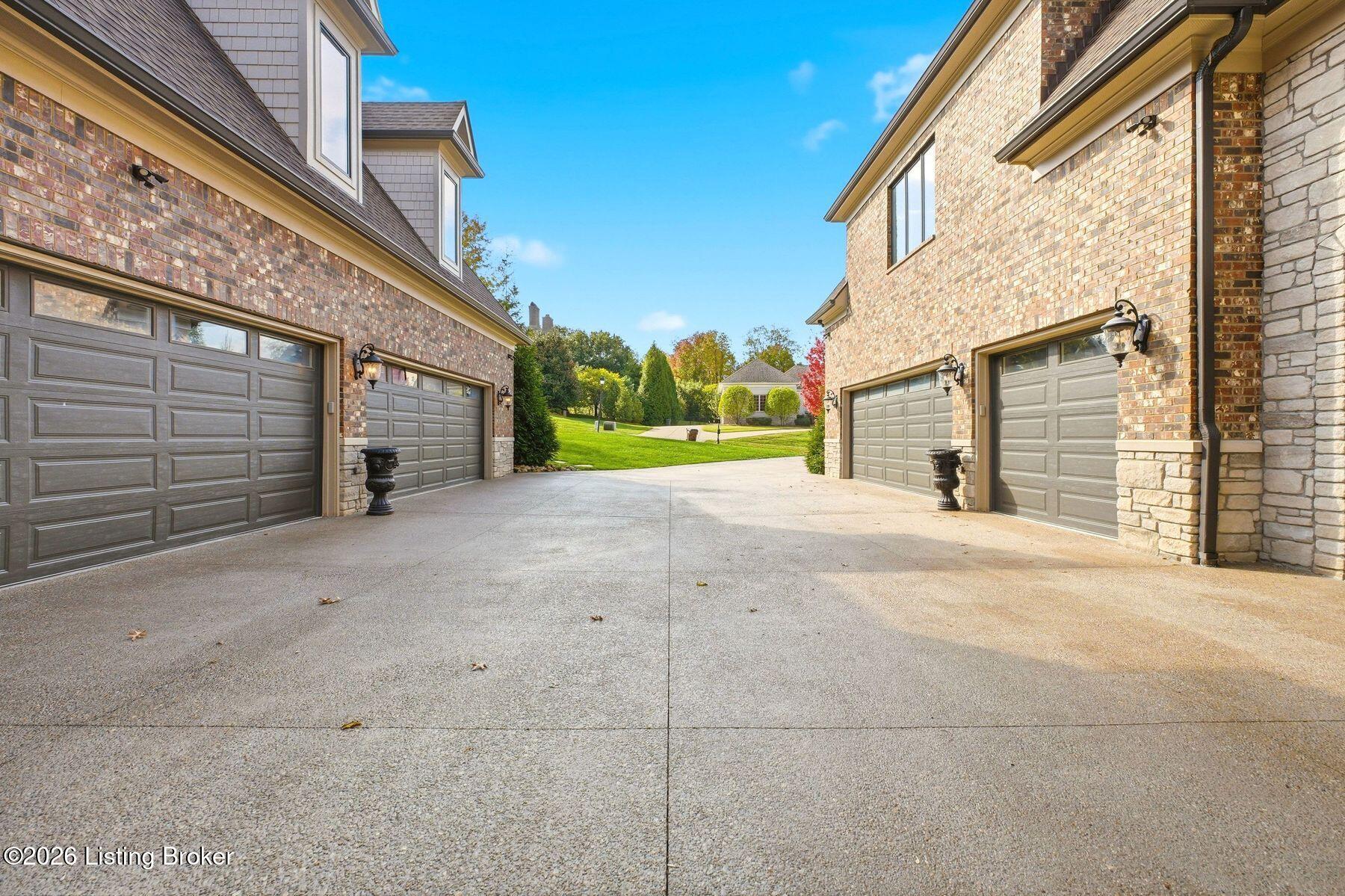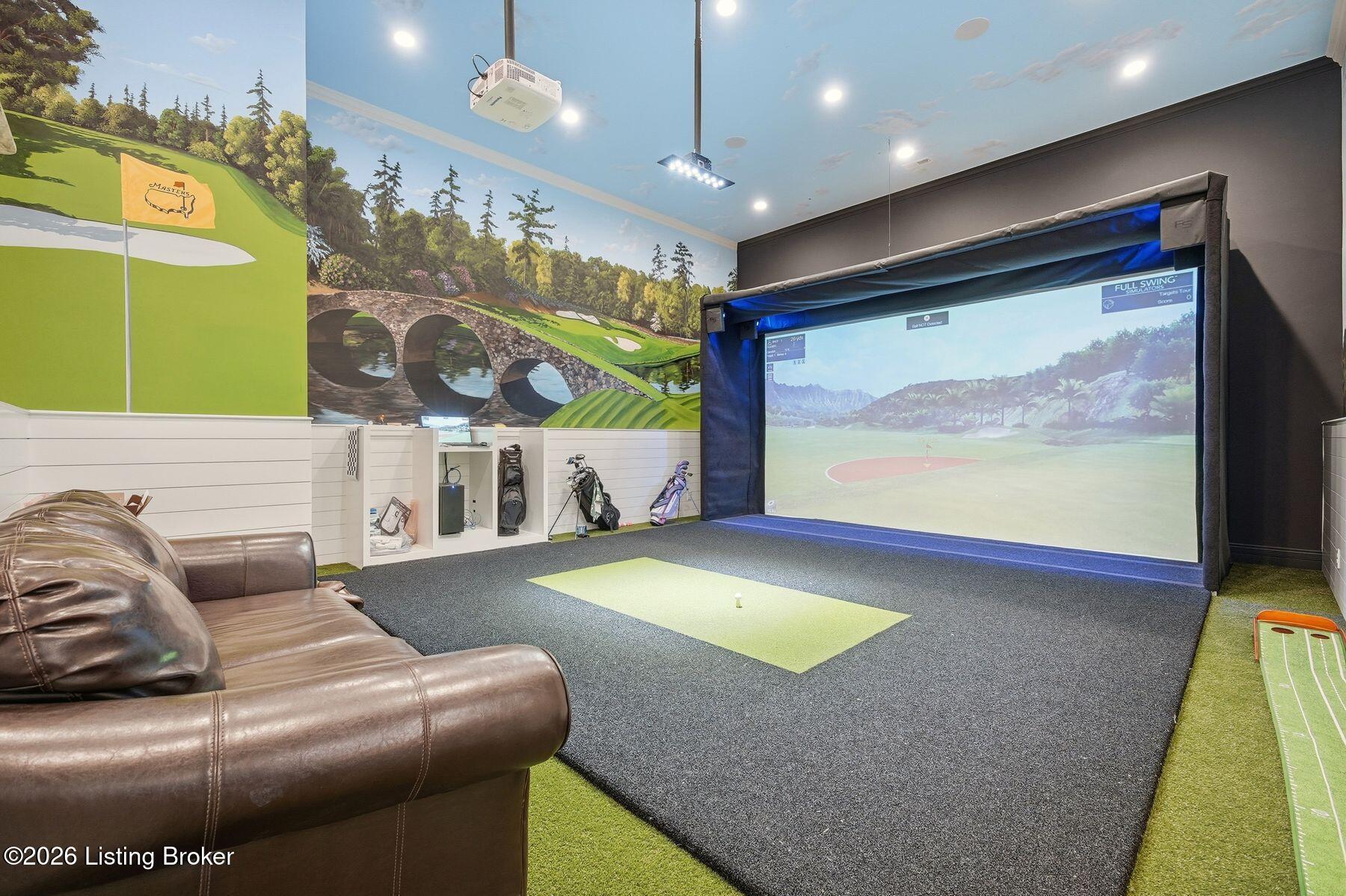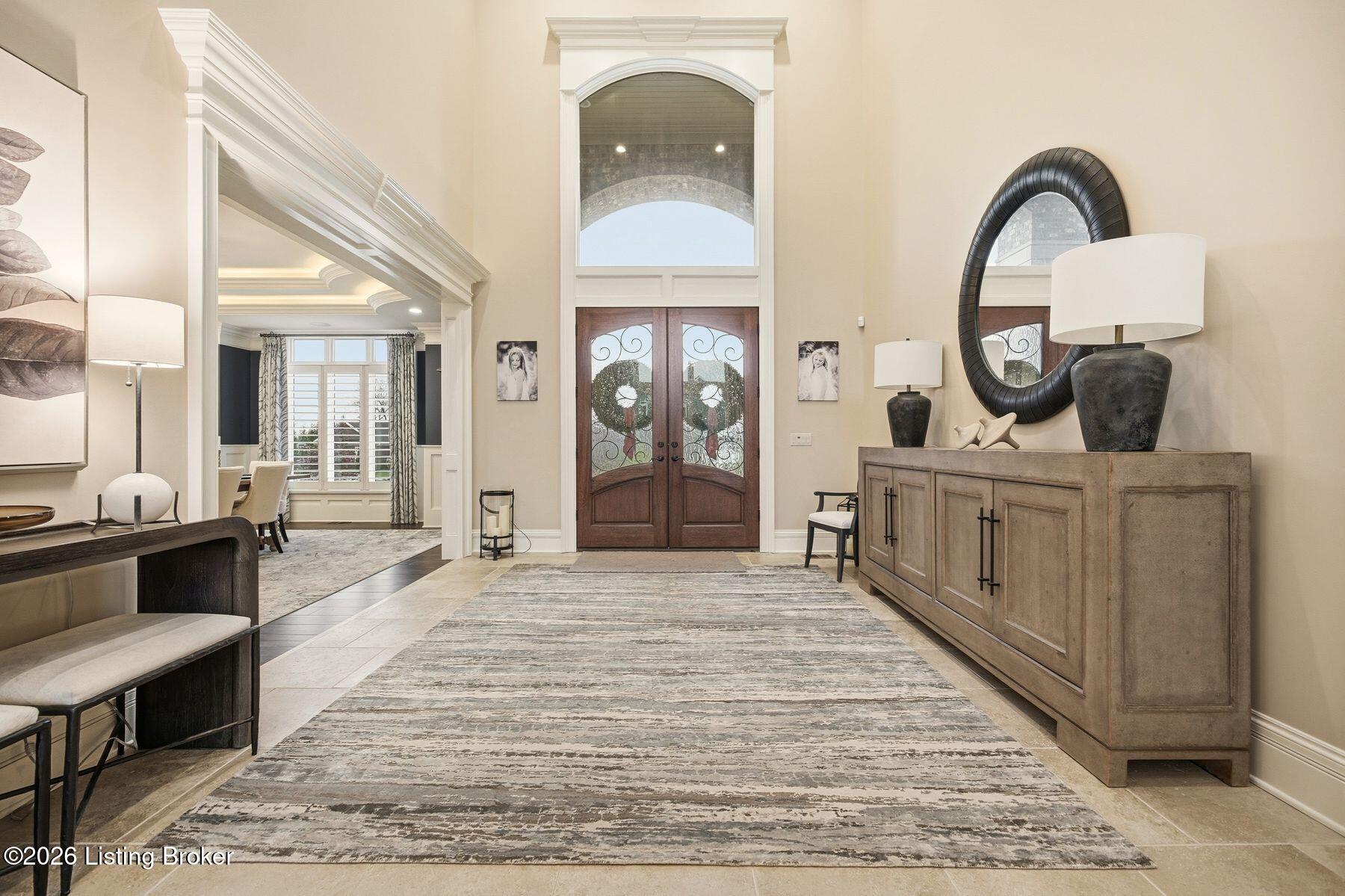 Tucked within one of Louisville's most coveted enclaves, this extraordinary custom estate redefines luxury at scale--offering more than 13,000 square feet of meticulously crafted living space. From the moment you approach along the circular drive, the property reveals its stature. A grand foyer unfolds with sightlines that capture the home's remarkable millwork, sweeping archways, and intricate ceiling treatments. Every detail has been curated to impress--from artisan inlays to master-crafted woodwork that elevates each space with a sense of bespoke artistry. At the heart of the home lies a culinary haven designed for both function and unforgettable gatherings. With double-layered granite surfaces, custom off-white cabinetry, a warm hearth-side ambiance, and professional-grade appliances this kitchen is truly in a league of its own. The flowing layout connects seamlessly to a vaulted hearth room with a floor-to-ceiling creek-stone fireplace and an additional family room framed by coffered ceilings perfect for effortless entertaining. The primary suite is an ode to luxury living. Romantic arched ceilings, a fireplace-lit soaking tub, a spa-inspired steam shower, and dual boutique-style closets create a private world of indulgence. The bedroom itself features elegant tray ceilings with ambient shadow-box lighting, a fireside sitting area, and direct access to the resort-style pool terrace blurring the line between indoor comfort and outdoor serenity. A graceful staircase leads to three spacious bedroom suites, an airy loft, and a cozy sitting area. Ample unfinished space provides flexibility for storage or future customization. Created for hosting and leisure, the lower level is nothing short of spectacular. A state-of-the-art theater, expansive entertainment bar, and an immersive golf simulator room make it the ultimate retreat. A dedicated fitness room and two additional bedrooms with daylight windows add comfort and convenience for guests. The outdoor living experience rivals luxury vacation destinations. The gunite saltwater pool with waterfall, hot tub, and surrounding lounging terraces sets the tone. Beyond the pool, manicured putting greens and a full-scale, multi-sport court with three basketball goals offer tennis, volleyball, pickleball, and basketball perfect for both family fun and serious athletes. An outdoor pavilion featuring a fireplace, grill, and refrigerator connects directly to the kitchen, creating an effortless indoor-outdoor flow ideal for hosting at any scale. More than a magnificent residence, this estate delivers a lifestyle one that balances privacy, comfort, grandeur, and recreation. It is a rare opportunity to live within a personal resort crafted for unforgettable moments and everyday ease.