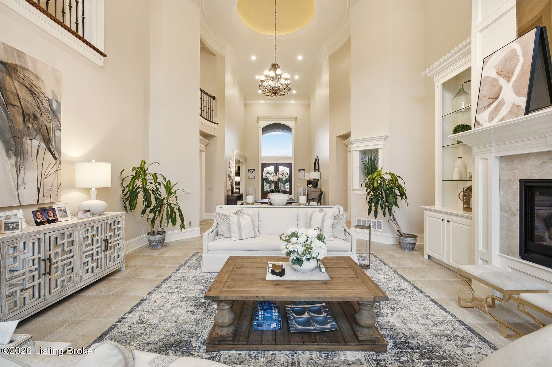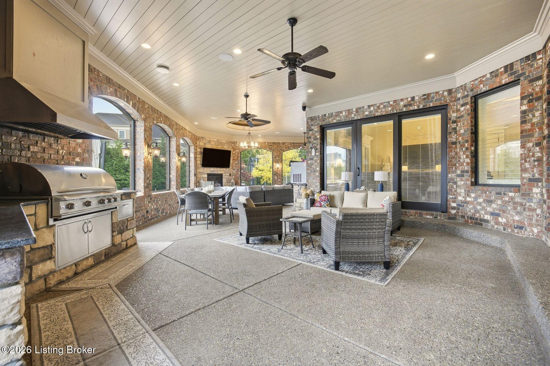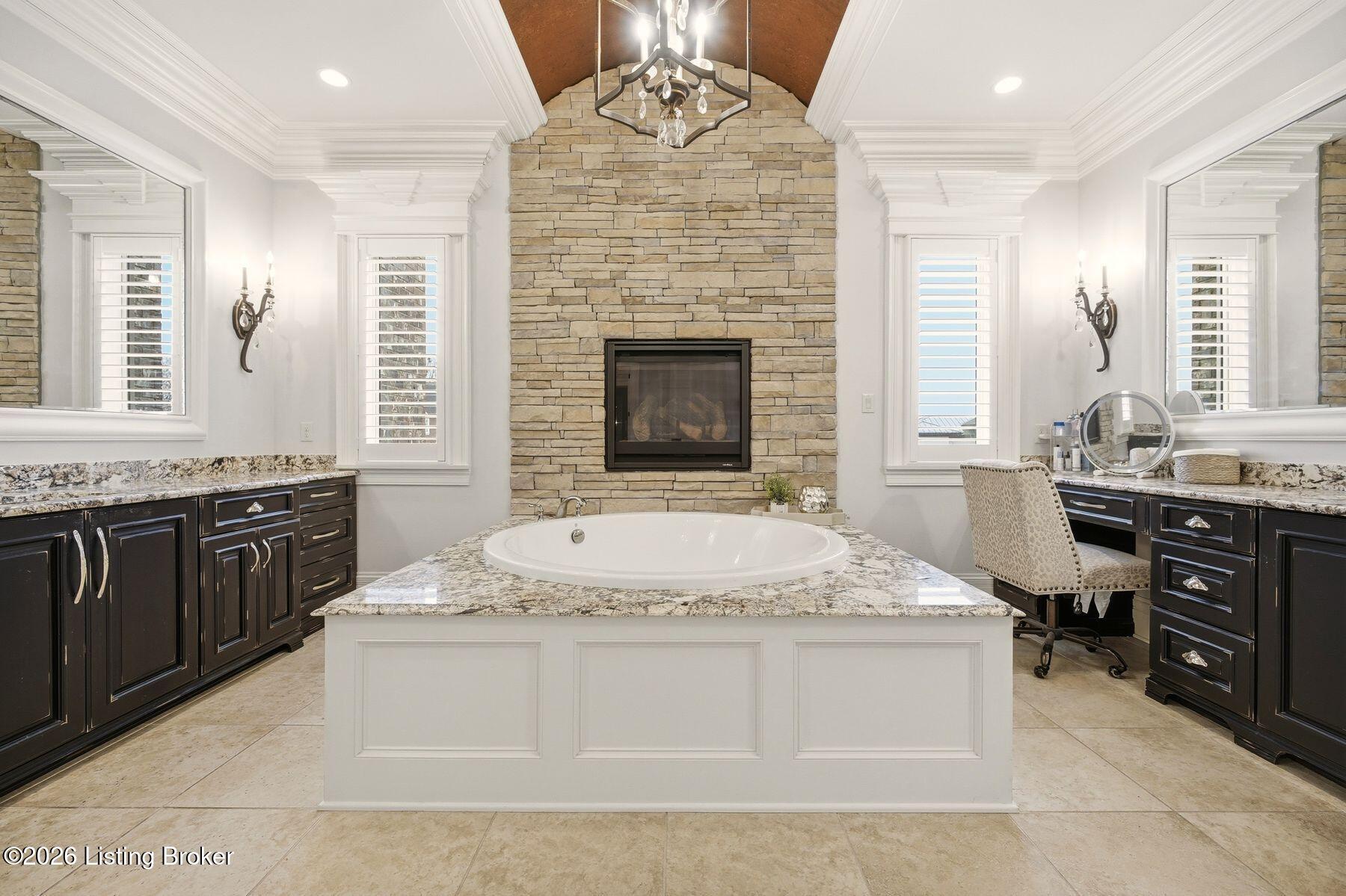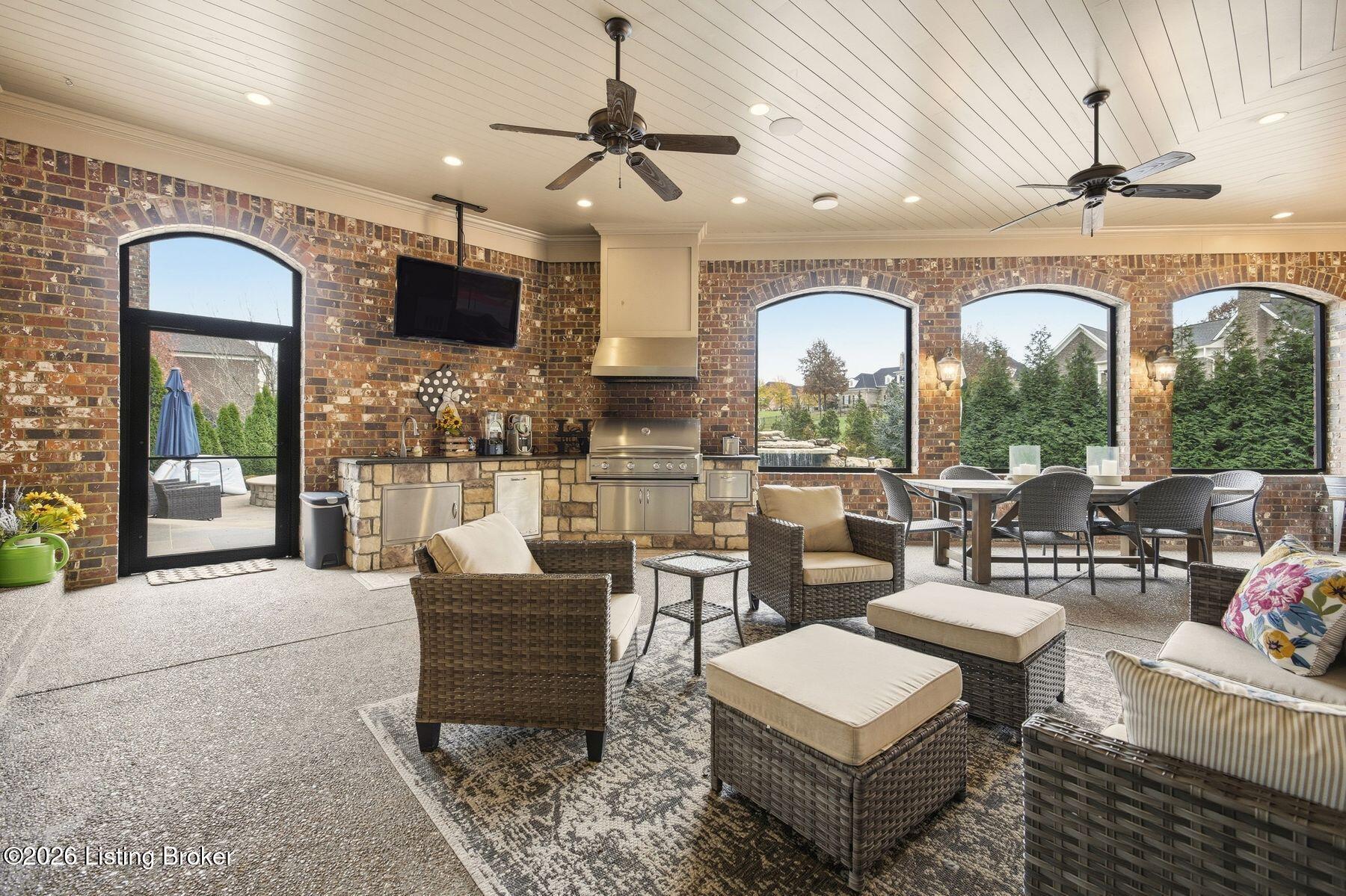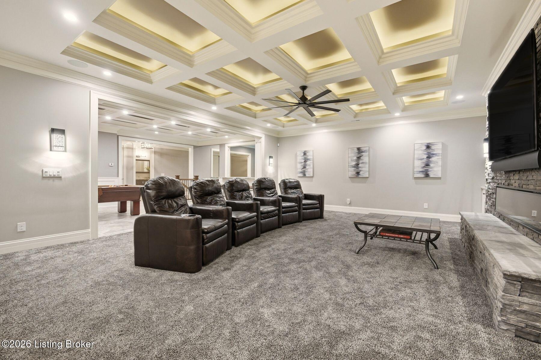 Tucked within one of Louisville's most coveted enclaves, this extraordinary custom estate redefines luxury at scale--offering more than 13,000 square feet of meticulously crafted living space. From the moment you approach along the circular drive, the property reveals its stature. A grand foyer unfolds with sightlines that capture the home's remarkable millwork, sweeping archways, and intricate ceiling treatments. Every detail has been curated to impress--from artisan inlays to master-crafted woodwork that elevates each space with a sense of bespoke artistry. At the heart of the home lies a culinary haven designed for both function and unforgettable gatherings. With double-layered granite surfaces, custom off-white cabinetry, a warm hearth-side ambiance, and professional-grade appliances this kitchen is truly in a league of its own. The flowing layout connects seamlessly to a vaulted hearth room with a floor-to-ceiling creek-stone fireplace and an additional family room framed by coffered ceilings perfect for effortless entertaining. The primary suite is an ode to luxury living. Romantic arched ceilings, a fireplace-lit soaking tub, a spa-inspired steam shower, and dual boutique-style closets create a private world of indulgence. The bedroom itself features elegant tray ceilings with ambient shadow-box lighting, a fireside sitting area, and direct access to the resort-style pool terrace blurring the line between indoor comfort and outdoor serenity. A graceful staircase leads to three spacious bedroom suites, an airy loft, and a cozy sitting area. Ample unfinished space provides flexibility for storage or future customization. Created for hosting and leisure, the lower level is nothing short of spectacular. A state-of-the-art theater, expansive entertainment bar, and an immersive golf simulator room make it the ultimate retreat. A dedicated fitness room and two additional bedrooms with daylight windows add comfort and convenience for guests. The outdoor living experience rivals luxury vacation destinations. The gunite saltwater pool with waterfall, hot tub, and surrounding lounging terraces sets the tone. Beyond the pool, manicured putting greens and a full-scale, multi-sport court with three basketball goals offer tennis, volleyball, pickleball, and basketball perfect for both family fun and serious athletes. An outdoor pavilion featuring a fireplace, grill, and refrigerator connects directly to the kitchen, creating an effortless indoor-outdoor flow ideal for hosting at any scale. More than a magnificent residence, this estate delivers a lifestyle one that balances privacy, comfort, grandeur, and recreation. It is a rare opportunity to live within a personal resort crafted for unforgettable moments and everyday ease.