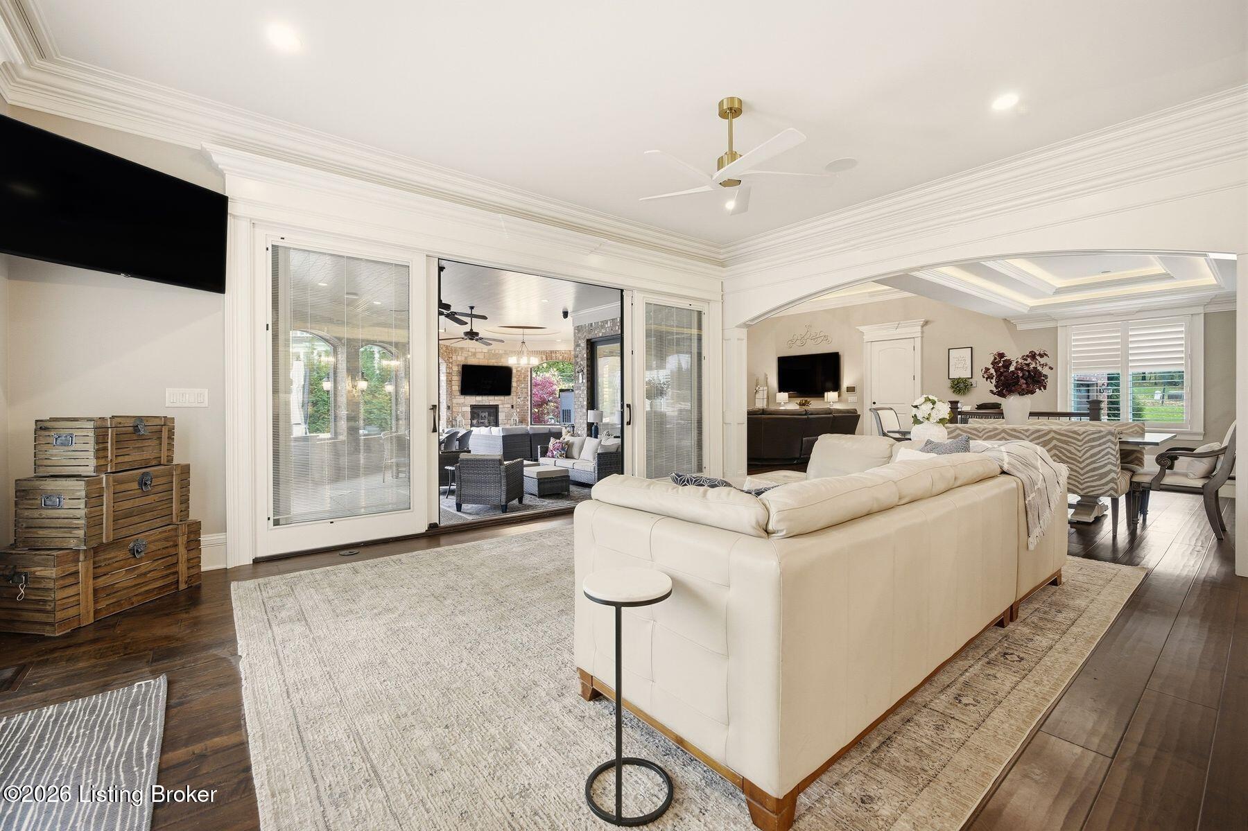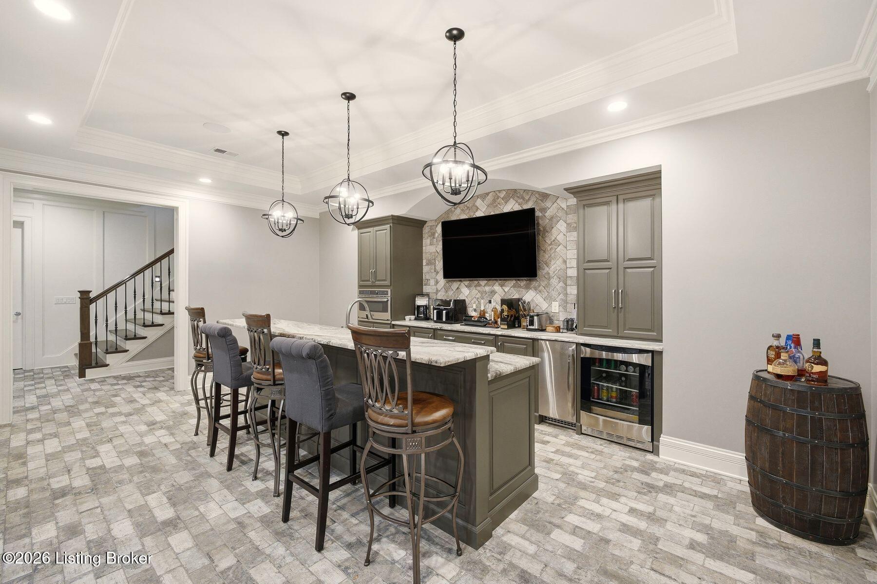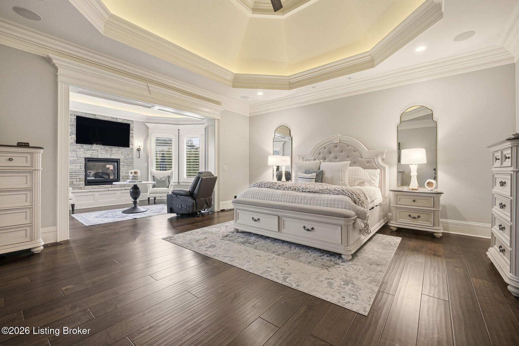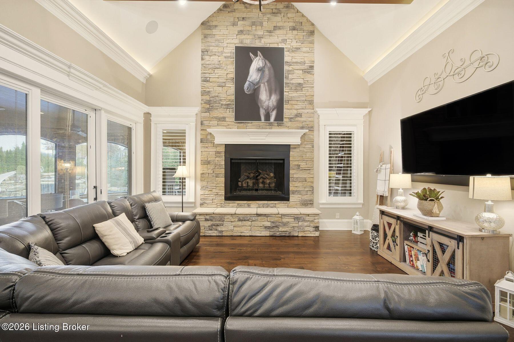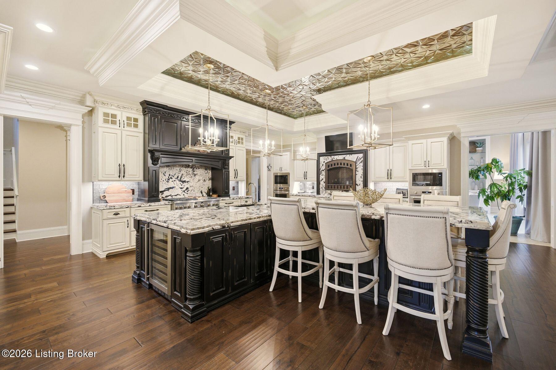 Tucked within one of Louisville's most coveted enclaves, this extraordinary custom estate redefines luxury at scale--offering more than 13,000 square feet of meticulously crafted living space. From the moment you approach along the circular drive, the property reveals its stature. A grand foyer unfolds with sightlines that capture the home's remarkable millwork, sweeping archways, and intricate ceiling treatments. Every detail has been curated to impress--from artisan inlays to master-crafted woodwork that elevates each space with a sense of bespoke artistry. At the heart of the home lies a culinary haven designed for both function and unforgettable gatherings. With double-layered granite surfaces, custom off-white cabinetry, a warm hearth-side ambiance, and professional-grade appliances this kitchen is truly in a league of its own. The flowing layout connects seamlessly to a vaulted hearth room with a floor-to-ceiling creek-stone fireplace and an additional family room framed by coffered ceilings perfect for effortless entertaining. The primary suite is an ode to luxury living. Romantic arched ceilings, a fireplace-lit soaking tub, a spa-inspired steam shower, and dual boutique-style closets create a private world of indulgence. The bedroom itself features elegant tray ceilings with ambient shadow-box lighting, a fireside sitting area, and direct access to the resort-style pool terrace blurring the line between indoor comfort and outdoor serenity. A graceful staircase leads to three spacious bedroom suites, an airy loft, and a cozy sitting area. Ample unfinished space provides flexibility for storage or future customization. Created for hosting and leisure, the lower level is nothing short of spectacular. A state-of-the-art theater, expansive entertainment bar, and an immersive golf simulator room make it the ultimate retreat. A dedicated fitness room and two additional bedrooms with daylight windows add comfort and convenience for guests. The outdoor living experience rivals luxury vacation destinations. The gunite saltwater pool with waterfall, hot tub, and surrounding lounging terraces sets the tone. Beyond the pool, manicured putting greens and a full-scale, multi-sport court with three basketball goals offer tennis, volleyball, pickleball, and basketball perfect for both family fun and serious athletes. An outdoor pavilion featuring a fireplace, grill, and refrigerator connects directly to the kitchen, creating an effortless indoor-outdoor flow ideal for hosting at any scale. More than a magnificent residence, this estate delivers a lifestyle one that balances privacy, comfort, grandeur, and recreation. It is a rare opportunity to live within a personal resort crafted for unforgettable moments and everyday ease.