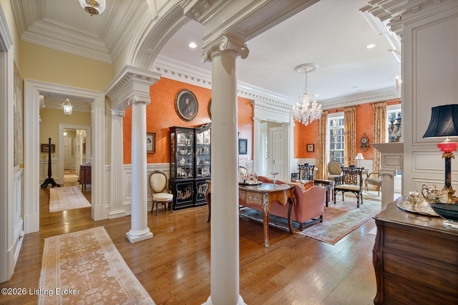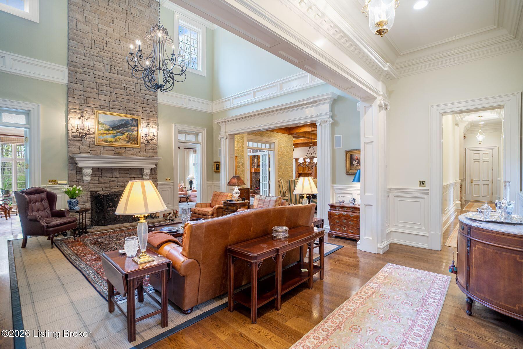 Designed for both elegant entertaining and everyday living, the formal dining room features exquisite custom woodwork and one of seven fireplaces throughout the home. The gourmet kitchen is a true showpiece for culinary enthusiasts, complete with premium appliances, abundant cabinetry, and a charming hearth room ideal for intimate gatherings. Relax in the sun-filled all season room offering tranquil views and direct access to a balcony overlooking the pool and outdoor entertaining areas. Welcome to this expansive traditional estate, a private sanctuary of luxury and refinement set on nearly three acres of meticulously landscaped grounds. A grand marble foyer with a sweeping curved staircase sets the tone for this remarkable residence.