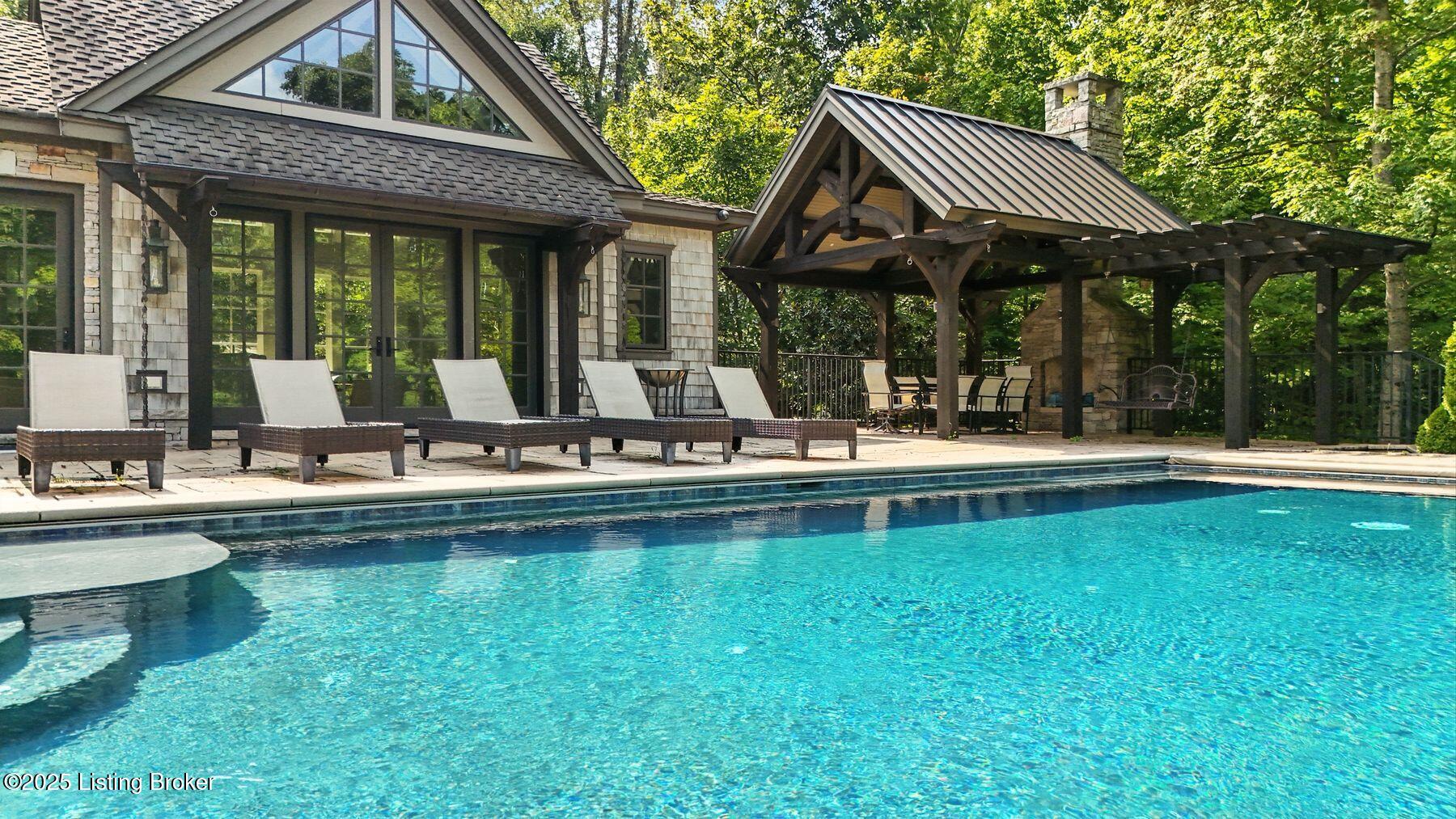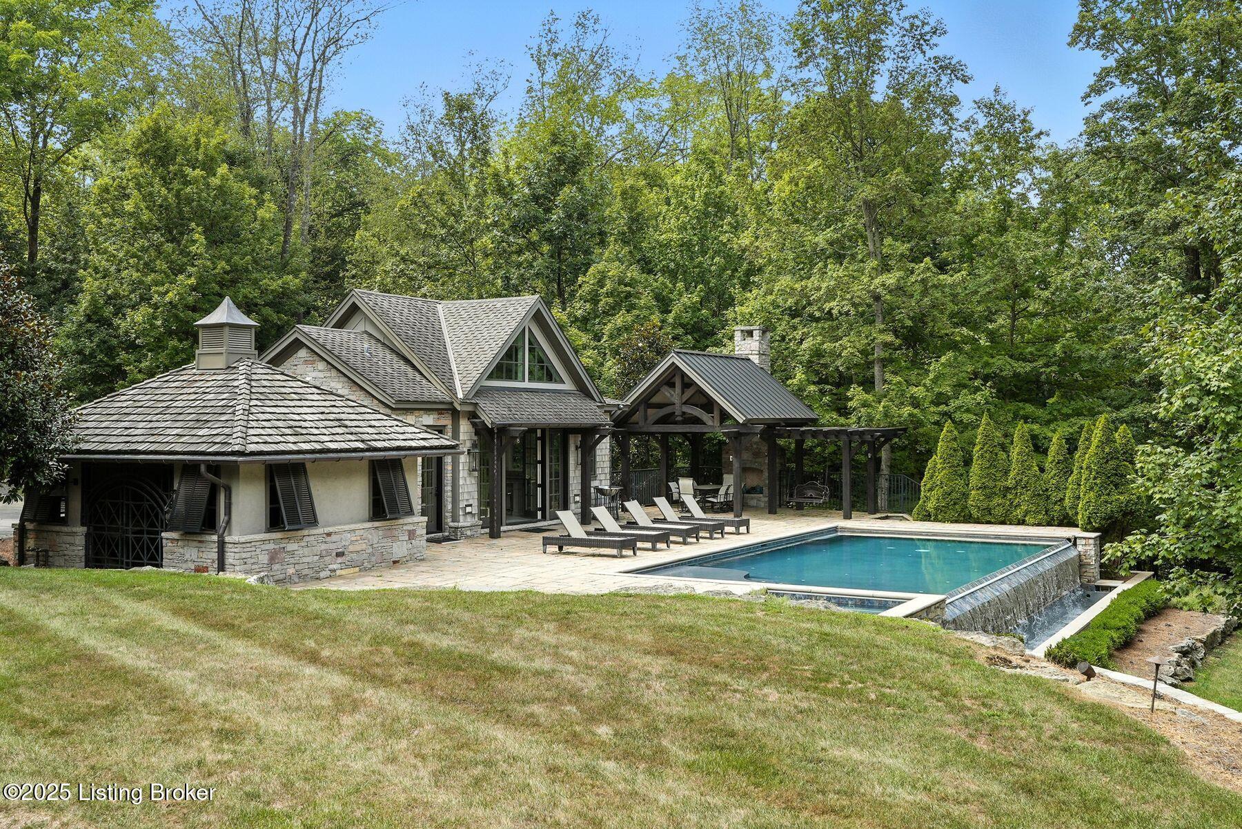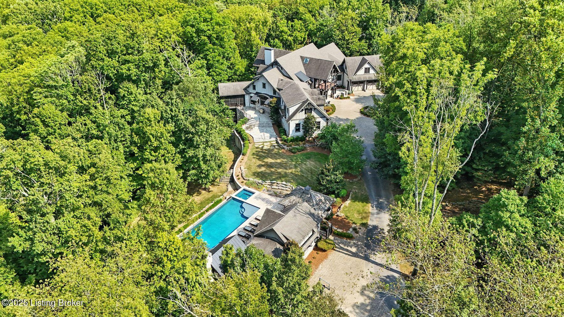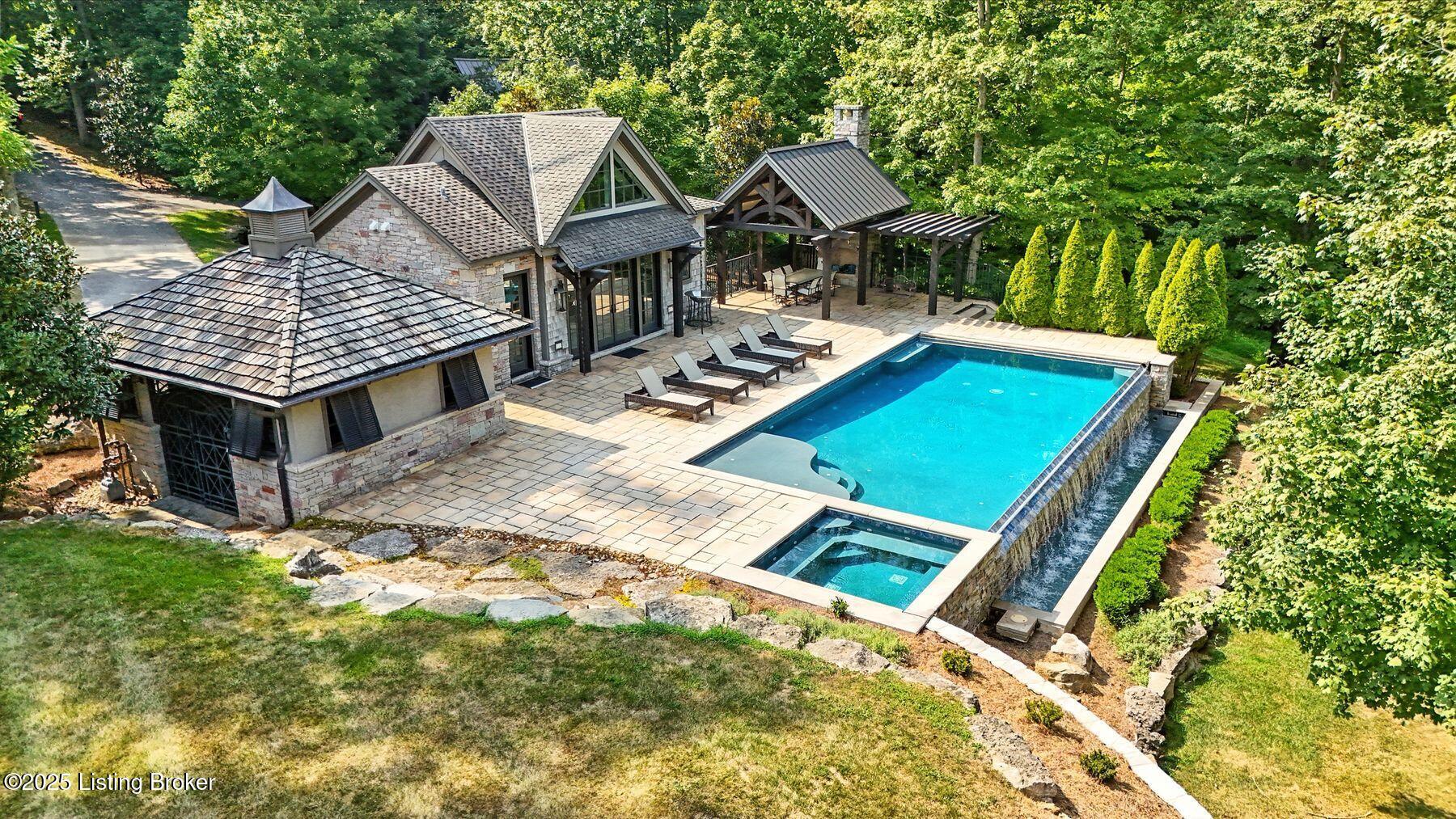 Nestled quietly within a canopy of trees, this natural timber home unfolds like a private sanctuary--part mountain retreat, part modern statement. The architecture feels rooted and intentional, blending organic materials with sleek lines and expansive glass that welcomes the outdoors in. Every space has been composed with balance and beauty in mind, creating a home that is as soulful as it is sophisticated. The entry hall sets the stage--dark wood floors, custom ironwork, and a graceful staircase that rises like sculpture. In the living room, floor-to-ceiling windows capture the forest beyond, while a coffered ceiling and stone fireplace add texture and warmth. Light spills across every surface, shifting gently throughout the day, creating an atmosphere that feels both expansive and intimately connected to nature. The kitchen is an exhibition of form and function: rich cabinetry, professional-grade appliances, and generous bar seating that encourages lingering conversation. Adjacent gathering spacesan inviting dining room and sitting areaoffer effortless flow, perfect for entertaining or quiet evenings spent among friends. A covered balcony hovers above the landscape, framing tree-top views and summer breezes. The primary suite occupies its own winga true retreat designed for rest and reflection. Vaulted ceilings and a fireplace set a tranquil tone, while a private office, dual walk-in closets, and a spa-inspired bath with marble surfaces, a copper soaking tub, and heated floors elevate every daily ritual. French doors open to the sounds of nature, blurring the line between indoors and out. Upstairs, a lofted family room and three bedroom suites continue the home's graceful design languageairy, bright, and welcoming. Below, a media and game room with a full bar invites easy entertaining, connecting to an expansive four-car garage that reflects the same attention to detail found throughout. Outdoors, the property reveals its most captivating moments. Five acres weave together manicured gardens and untamed woods, anchored by an infinity-edge pool that spills into a cascading waterfall. The pool housecomplete with kitchen and full bathroomoffers a quiet hideaway, equally suited for lively gatherings or peaceful solitude. A detached two-car garage with loft storage completes the setting, adding function to artistry. This is a home where architecture, nature, and craftsmanship exist in harmonya retreat designed not simply to be lived in, but to be felt.