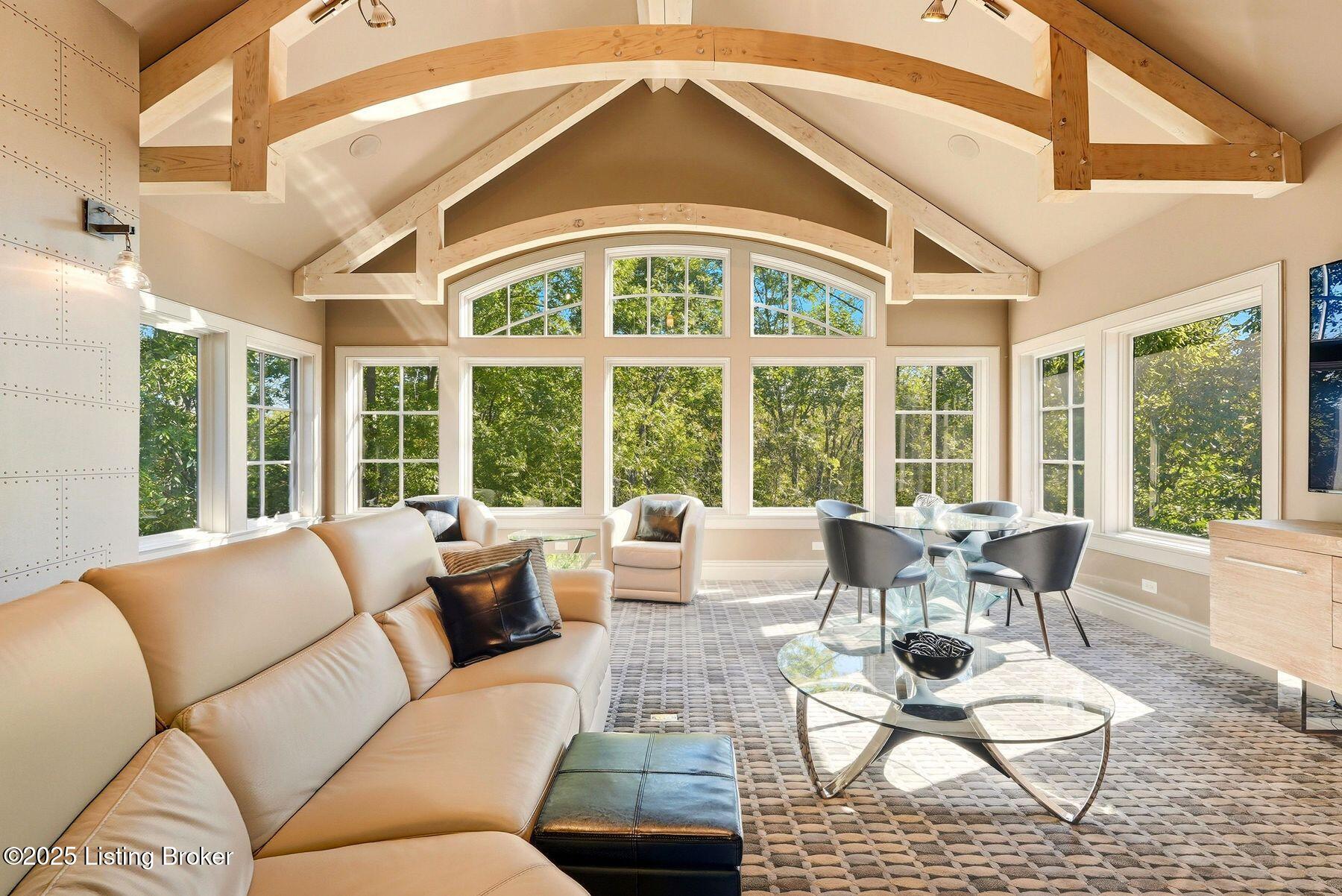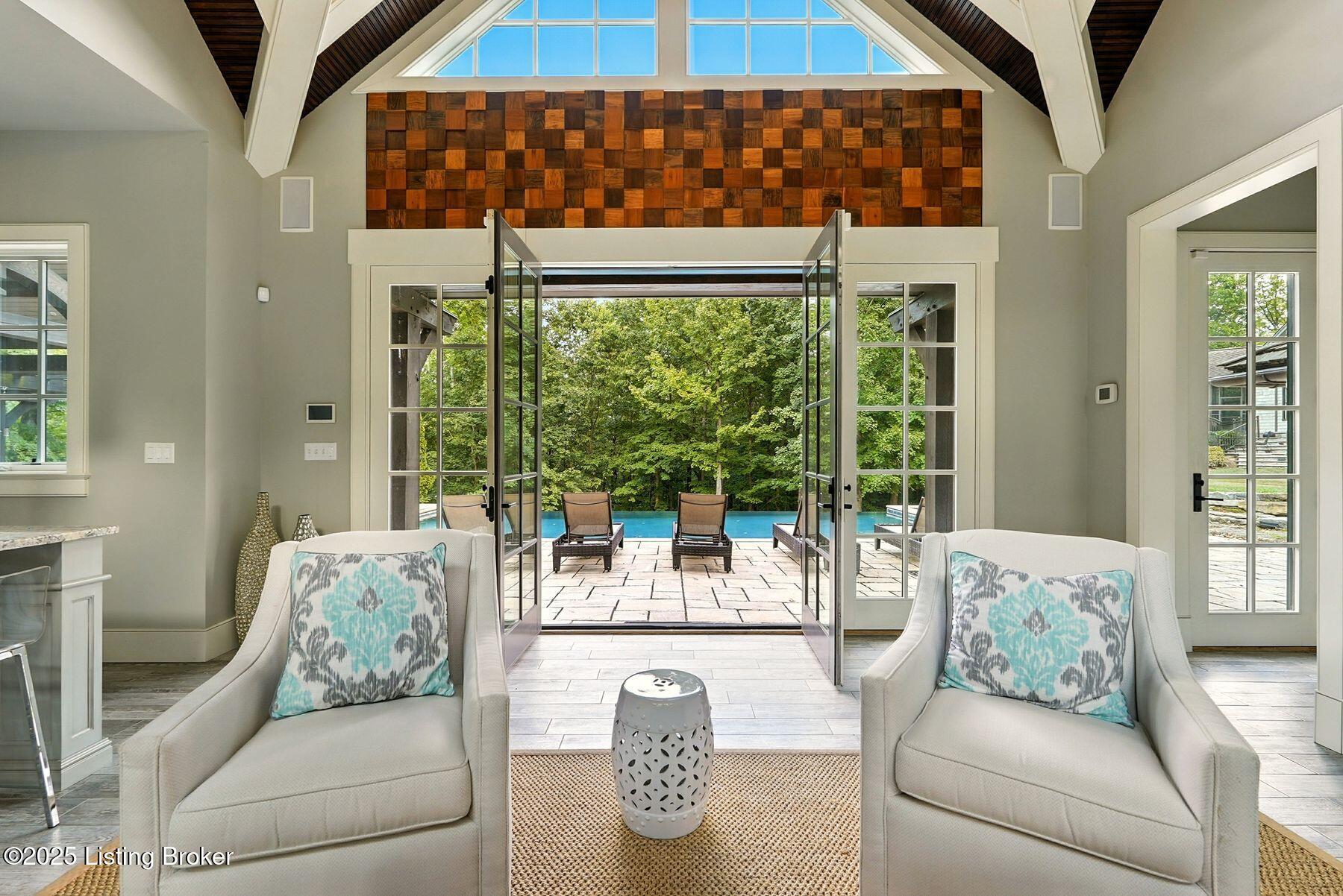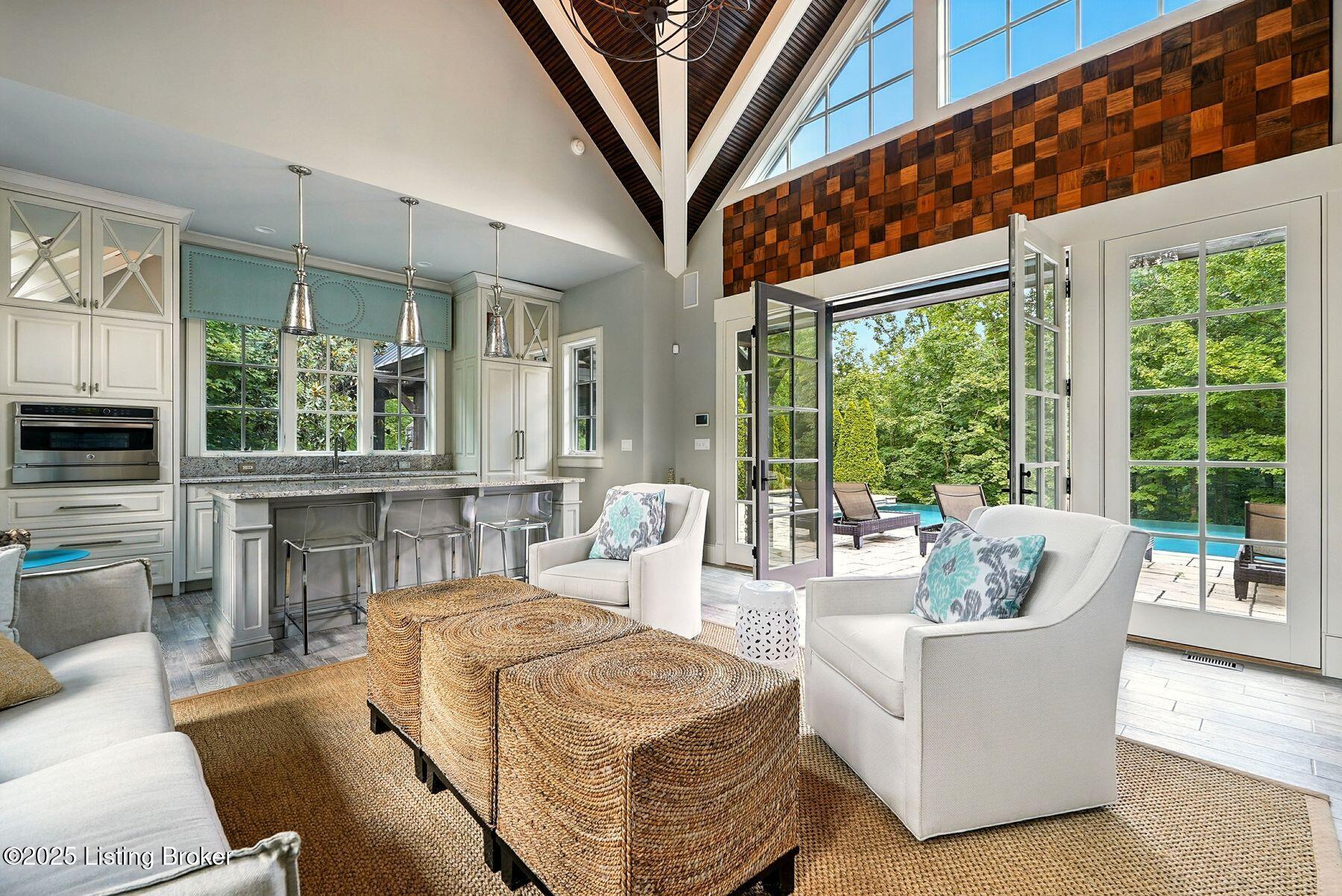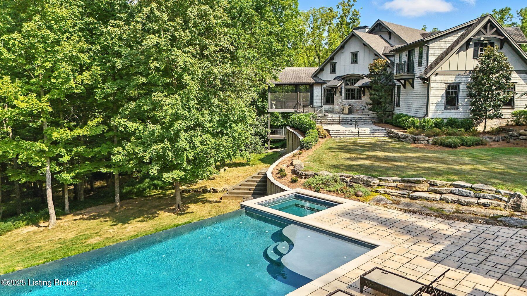 Nestled quietly within a canopy of trees, this natural timber home unfolds like a private sanctuary--part mountain retreat, part modern statement. The architecture feels rooted and intentional, blending organic materials with sleek lines and expansive glass that welcomes the outdoors in. Every space has been composed with balance and beauty in mind, creating a home that is as soulful as it is sophisticated. The entry hall sets the stage--dark wood floors, custom ironwork, and a graceful staircase that rises like sculpture. In the living room, floor-to-ceiling windows capture the forest beyond, while a coffered ceiling and stone fireplace add texture and warmth. Light spills across every surface, shifting gently throughout the day, creating an atmosphere that feels both expansive and intimately connected to nature. The kitchen is an exhibition of form and function: rich cabinetry, professional-grade appliances, and generous bar seating that encourages lingering conversation. Adjacent gathering spacesan inviting dining room and sitting areaoffer effortless flow, perfect for entertaining or quiet evenings spent among friends. A covered balcony hovers above the landscape, framing tree-top views and summer breezes. The primary suite occupies its own winga true retreat designed for rest and reflection. Vaulted ceilings and a fireplace set a tranquil tone, while a private office, dual walk-in closets, and a spa-inspired bath with marble surfaces, a copper soaking tub, and heated floors elevate every daily ritual. French doors open to the sounds of nature, blurring the line between indoors and out. Upstairs, a lofted family room and three bedroom suites continue the home's graceful design languageairy, bright, and welcoming. Below, a media and game room with a full bar invites easy entertaining, connecting to an expansive four-car garage that reflects the same attention to detail found throughout. Outdoors, the property reveals its most captivating moments. Five acres weave together manicured gardens and untamed woods, anchored by an infinity-edge pool that spills into a cascading waterfall. The pool housecomplete with kitchen and full bathroomoffers a quiet hideaway, equally suited for lively gatherings or peaceful solitude. A detached two-car garage with loft storage completes the setting, adding function to artistry. This is a home where architecture, nature, and craftsmanship exist in harmonya retreat designed not simply to be lived in, but to be felt.
