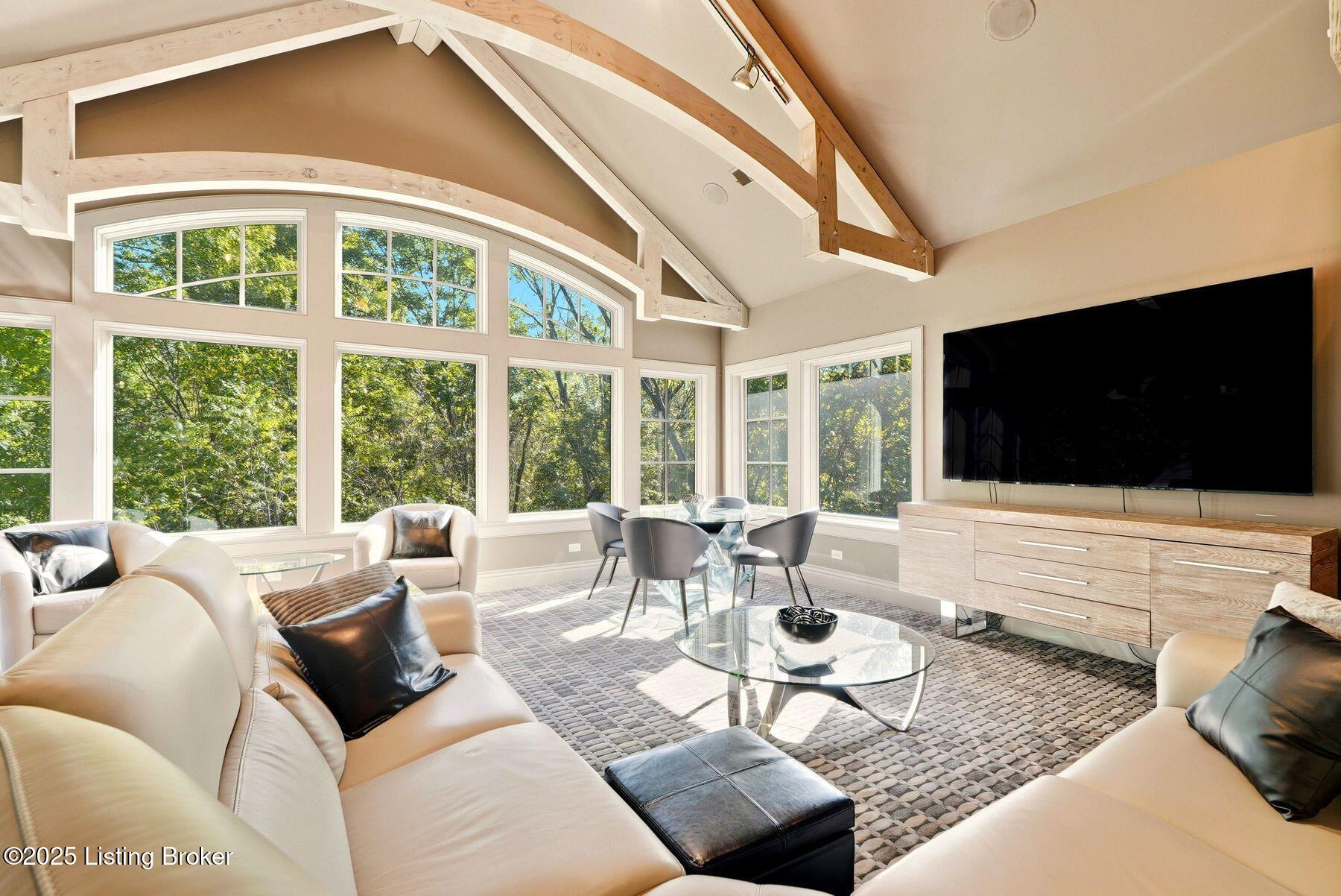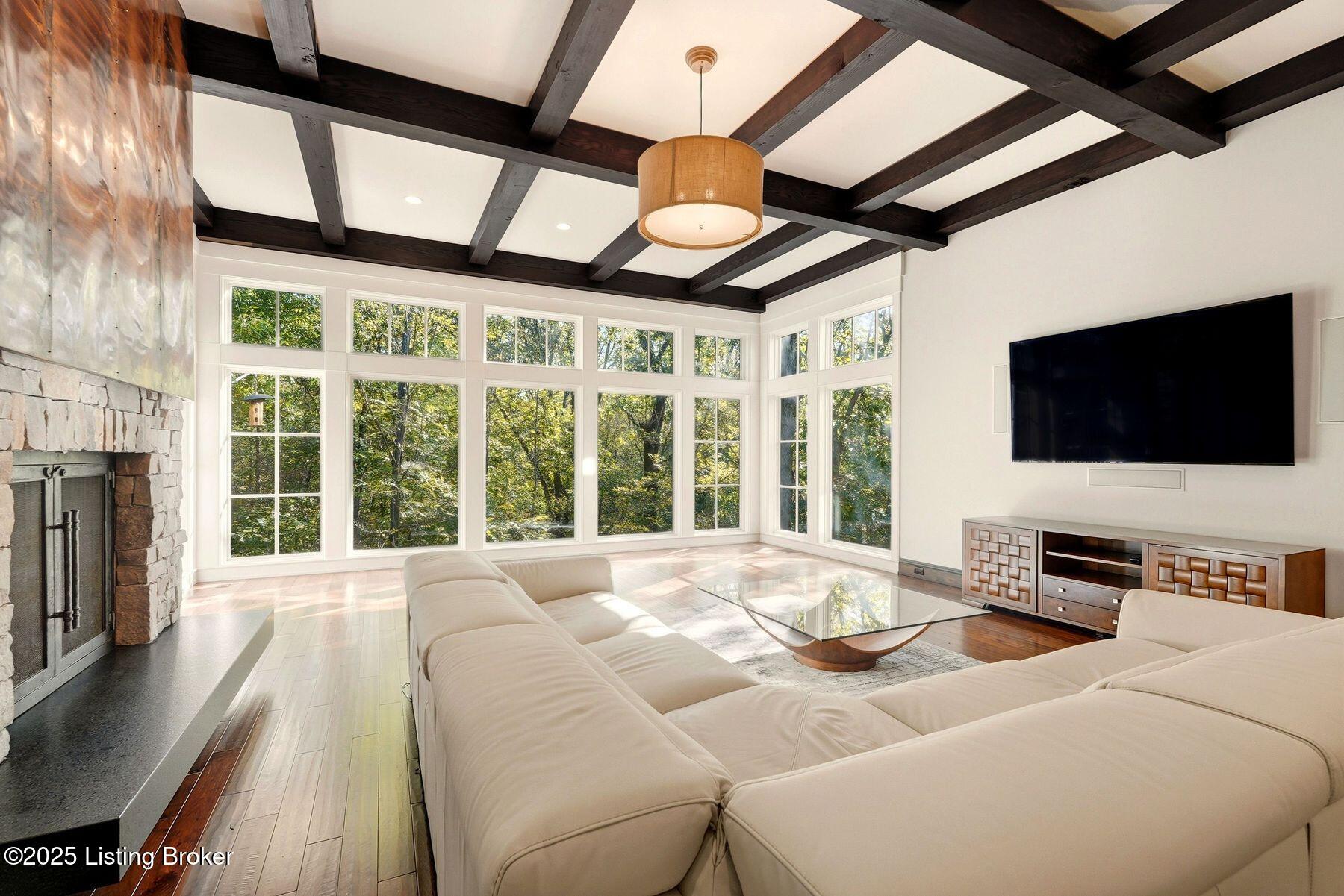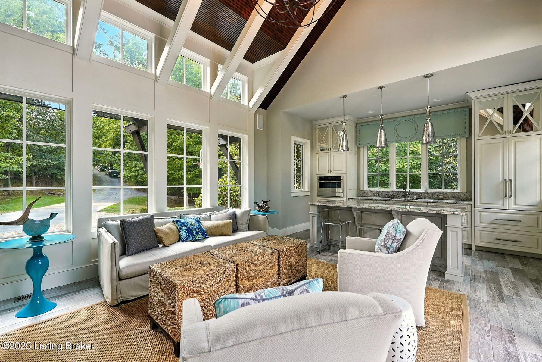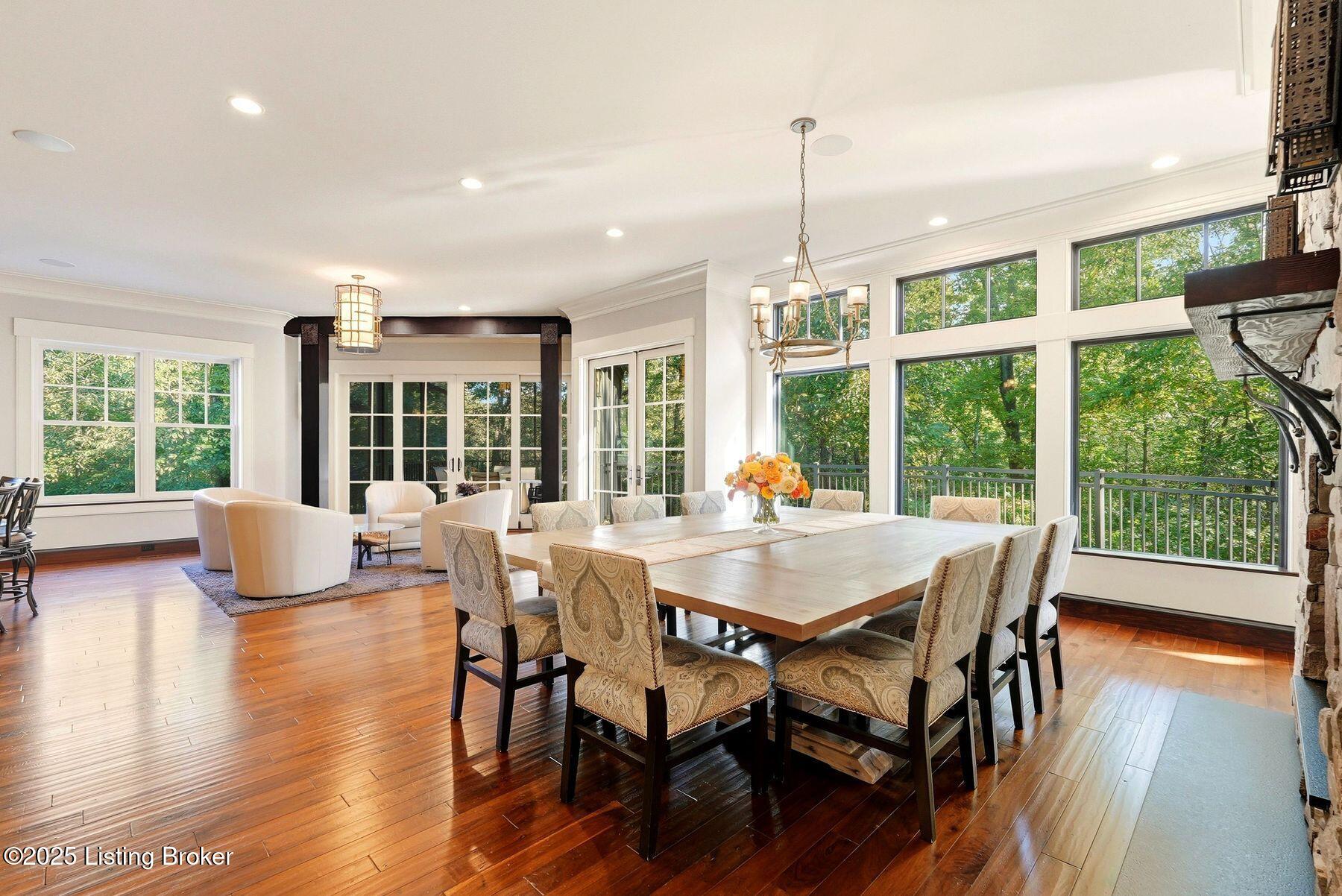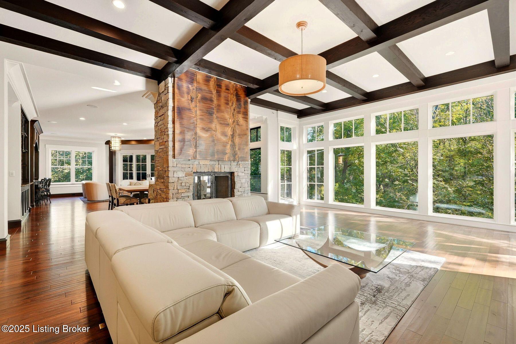Nestled quietly within a canopy of trees, this natural timber home unfolds like a private sanctuary--part mountain retreat, part modern statement. The architecture feels rooted and intentional, blending organic materials with sleek lines and expansive glass that welcomes the outdoors in. Every space has been composed with balance and beauty in mind, creating a home that is as soulful as it is sophisticated. The entry hall sets the stage--dark wood floors, custom ironwork, and a graceful staircase that rises like sculpture. In the living room, floor-to-ceiling windows capture the forest beyond, while a coffered ceiling and stone fireplace add texture and warmth. Light spills across every surface, shifting gently throughout the day, creating an atmosphere that feels both expansive and intimately connected to nature. The kitchen is an exhibition of form and function: rich cabinetry, professional-grade appliances, and generous bar seating that encourages lingering conversation. Adjacent gathering spacesan inviting dining room and sitting areaoffer effortless flow, perfect for entertaining or quiet evenings spent among friends. A covered balcony hovers above the landscape, framing tree-top views and summer breezes. The primary suite occupies its own winga true retreat designed for rest and reflection. Vaulted ceilings and a fireplace set a tranquil tone, while a private office, dual walk-in closets, and a spa-inspired bath with marble surfaces, a copper soaking tub, and heated floors elevate every daily ritual. French doors open to the sounds of nature, blurring the line between indoors and out. Upstairs, a lofted family room and three bedroom suites continue the home's graceful design languageairy, bright, and welcoming. Below, a media and game room with a full bar invites easy entertaining, connecting to an expansive four-car garage that reflects the same attention to detail found throughout. Outdoors, the property reveals its most captivating moments. Five acres weave together manicured gardens and untamed woods, anchored by an infinity-edge pool that spills into a cascading waterfall. The pool housecomplete with kitchen and full bathroomoffers a quiet hideaway, equally suited for lively gatherings or peaceful solitude. A detached two-car garage with loft storage completes the setting, adding function to artistry. This is a home where architecture, nature, and craftsmanship exist in harmonya retreat designed not simply to be lived in, but to be felt.