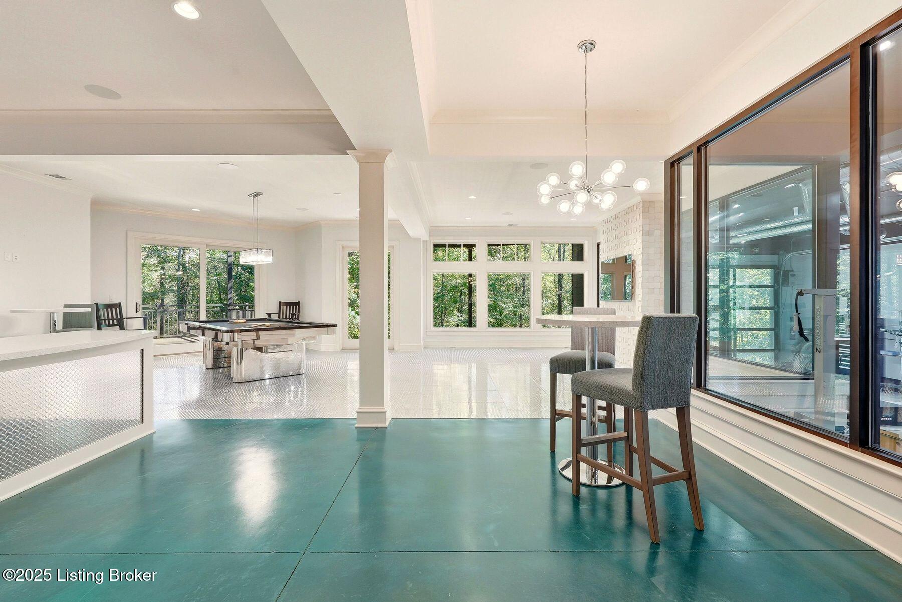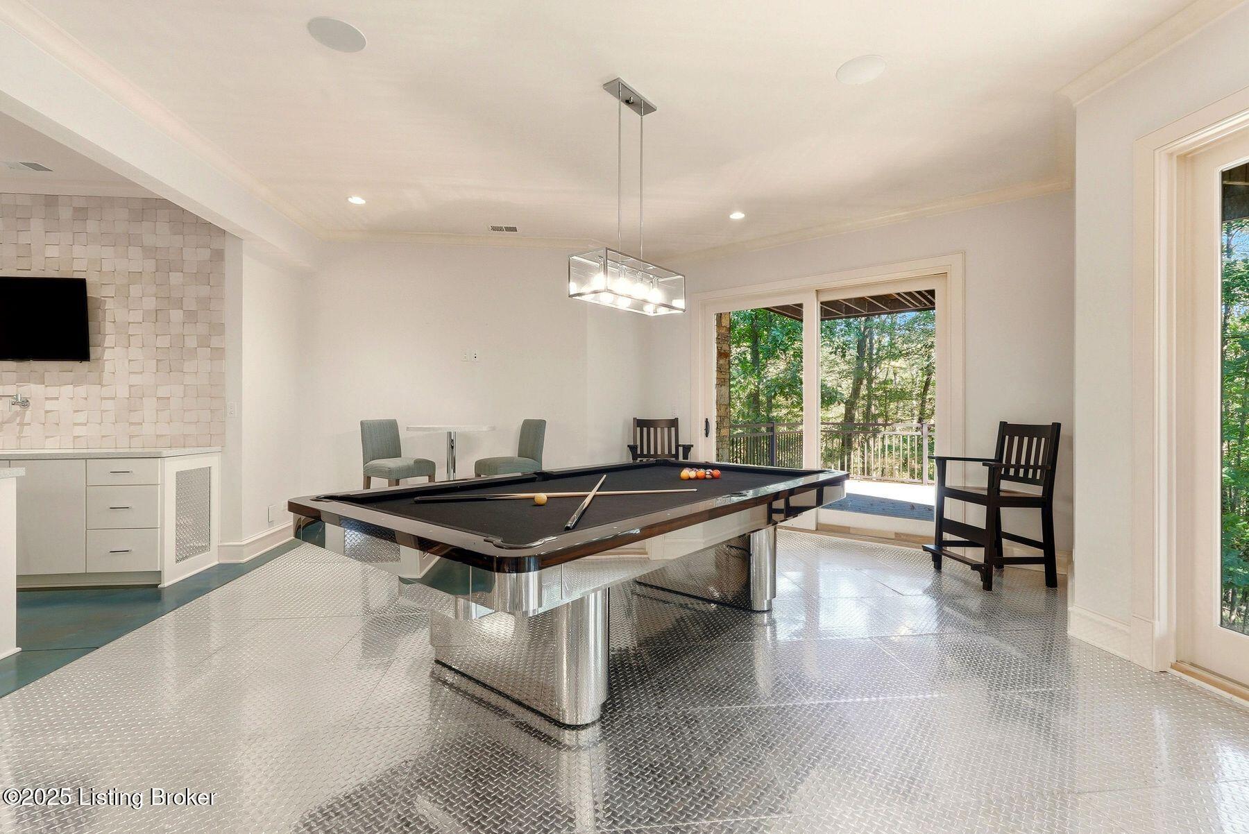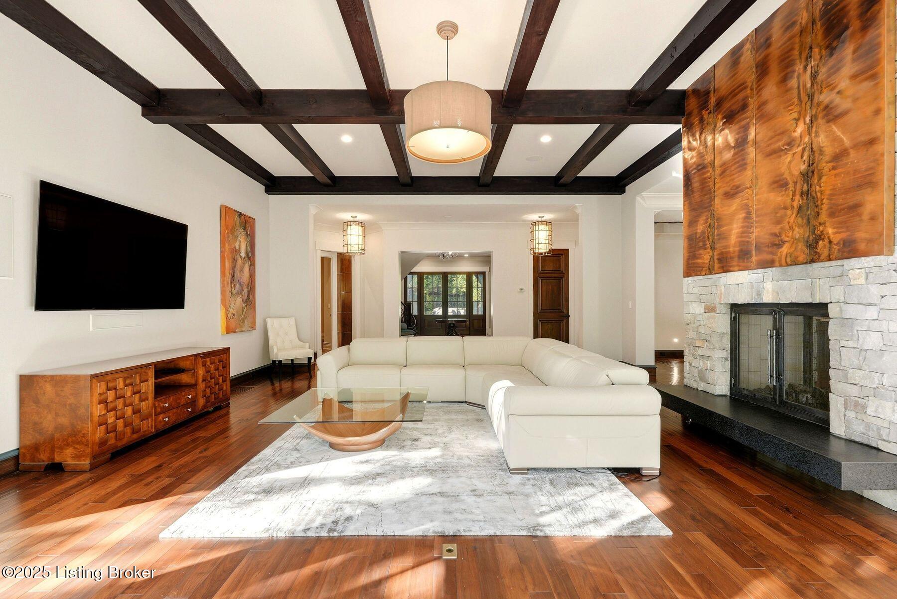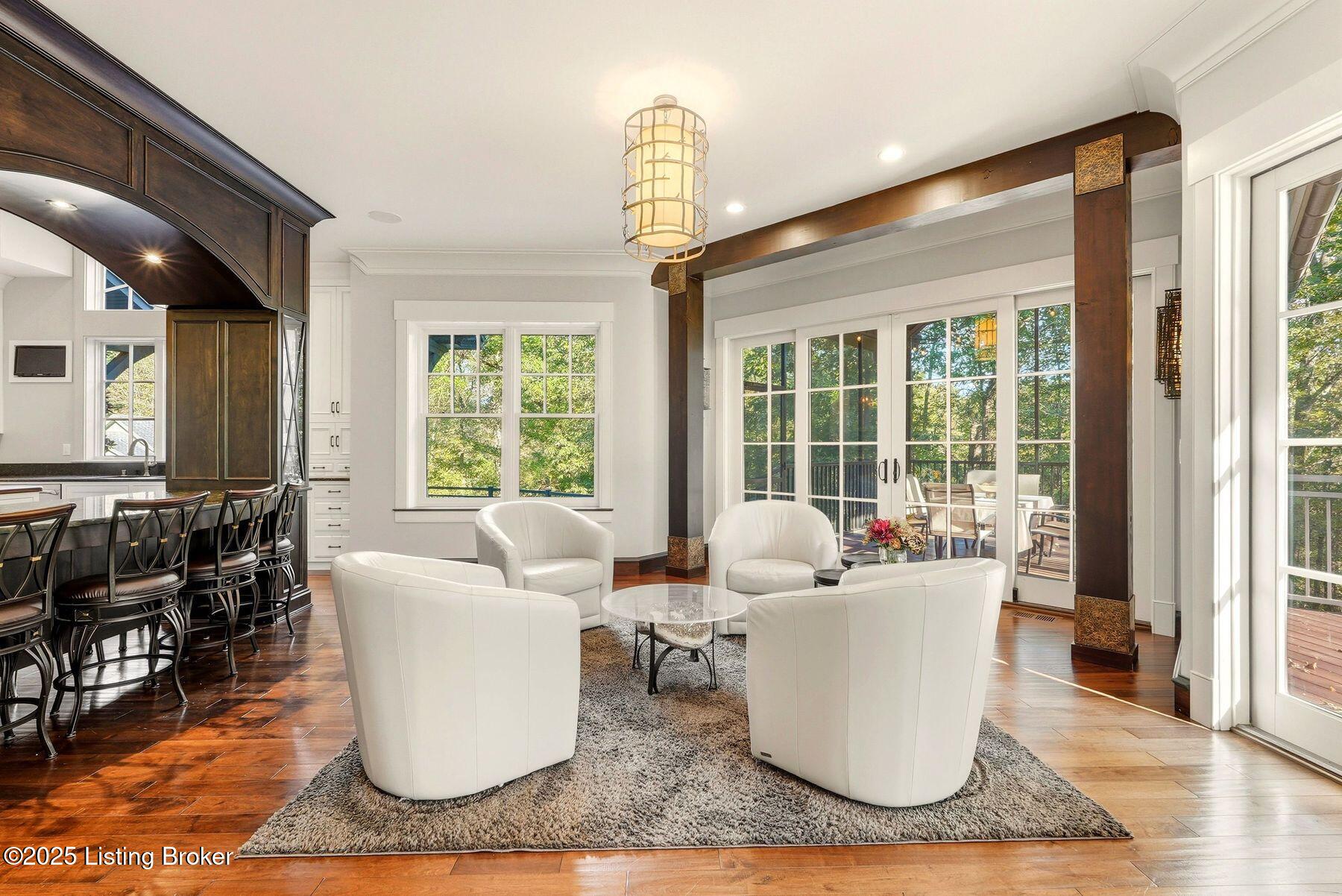 Nestled quietly within a canopy of trees, this natural timber home unfolds like a private sanctuary--part mountain retreat, part modern statement. The architecture feels rooted and intentional, blending organic materials with sleek lines and expansive glass that welcomes the outdoors in. Every space has been composed with balance and beauty in mind, creating a home that is as soulful as it is sophisticated. The entry hall sets the stage--dark wood floors, custom ironwork, and a graceful staircase that rises like sculpture. In the living room, floor-to-ceiling windows capture the forest beyond, while a coffered ceiling and stone fireplace add texture and warmth. Light spills across every surface, shifting gently throughout the day, creating an atmosphere that feels both expansive and intimately connected to nature. The kitchen is an exhibition of form and function: rich cabinetry, professional-grade appliances, and generous bar seating that encourages lingering conversation. Adjacent gathering spacesan inviting dining room and sitting areaoffer effortless flow, perfect for entertaining or quiet evenings spent among friends. A covered balcony hovers above the landscape, framing tree-top views and summer breezes. The primary suite occupies its own winga true retreat designed for rest and reflection. Vaulted ceilings and a fireplace set a tranquil tone, while a private office, dual walk-in closets, and a spa-inspired bath with marble surfaces, a copper soaking tub, and heated floors elevate every daily ritual. French doors open to the sounds of nature, blurring the line between indoors and out. Upstairs, a lofted family room and three bedroom suites continue the home's graceful design languageairy, bright, and welcoming. Below, a media and game room with a full bar invites easy entertaining, connecting to an expansive four-car garage that reflects the same attention to detail found throughout. Outdoors, the property reveals its most captivating moments. Five acres weave together manicured gardens and untamed woods, anchored by an infinity-edge pool that spills into a cascading waterfall. The pool housecomplete with kitchen and full bathroomoffers a quiet hideaway, equally suited for lively gatherings or peaceful solitude. A detached two-car garage with loft storage completes the setting, adding function to artistry. This is a home where architecture, nature, and craftsmanship exist in harmonya retreat designed not simply to be lived in, but to be felt.